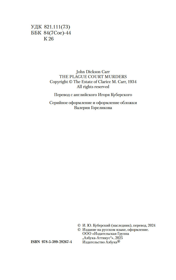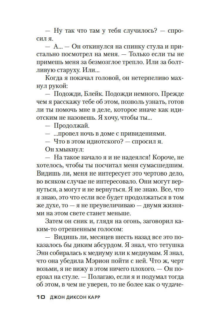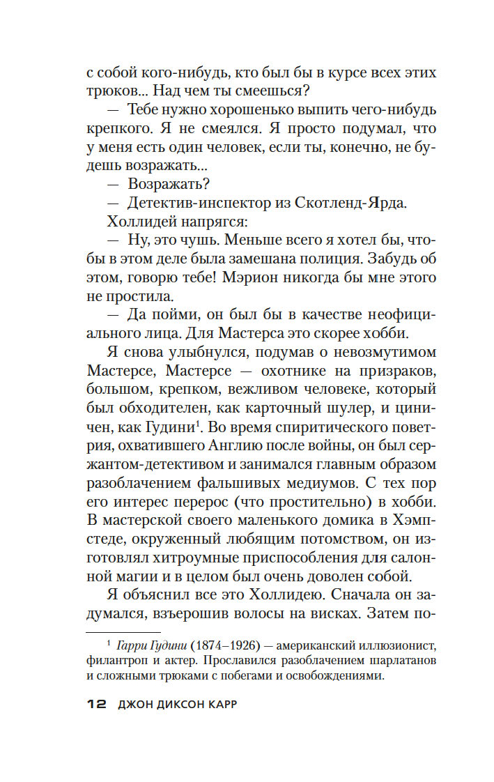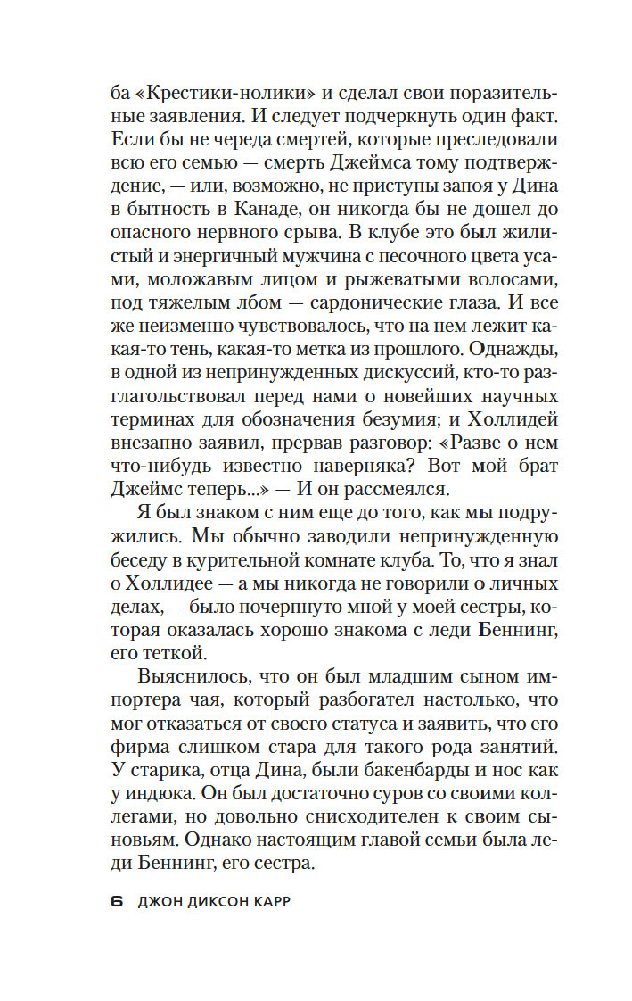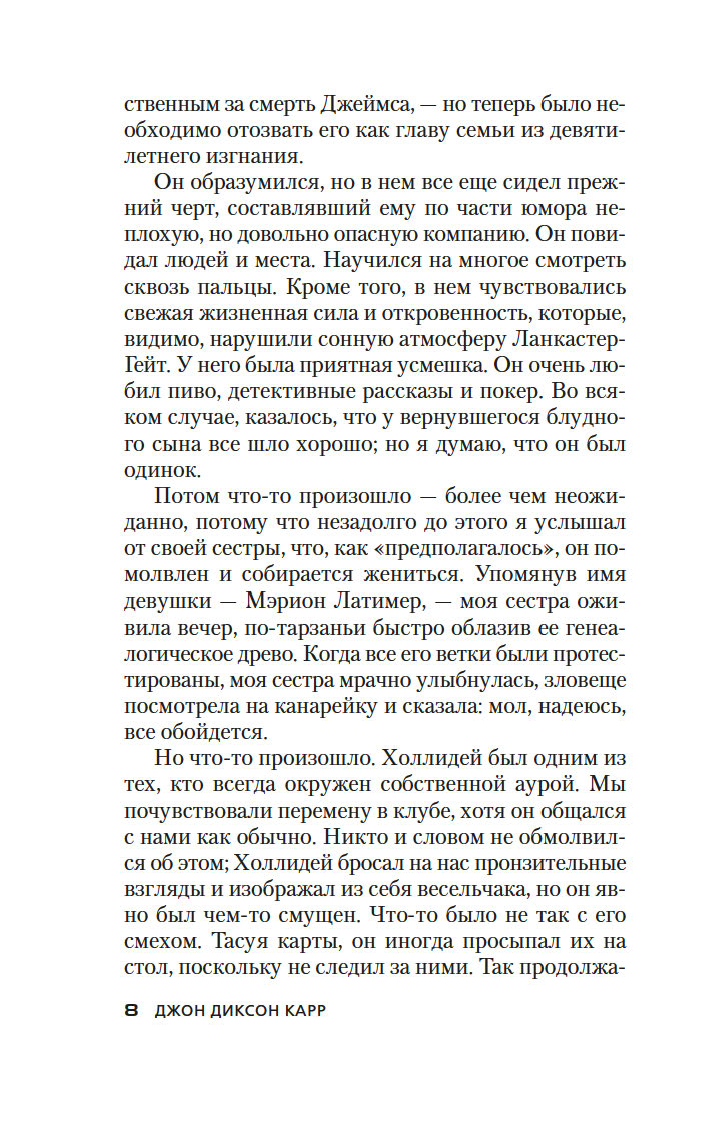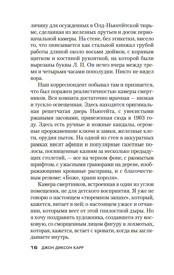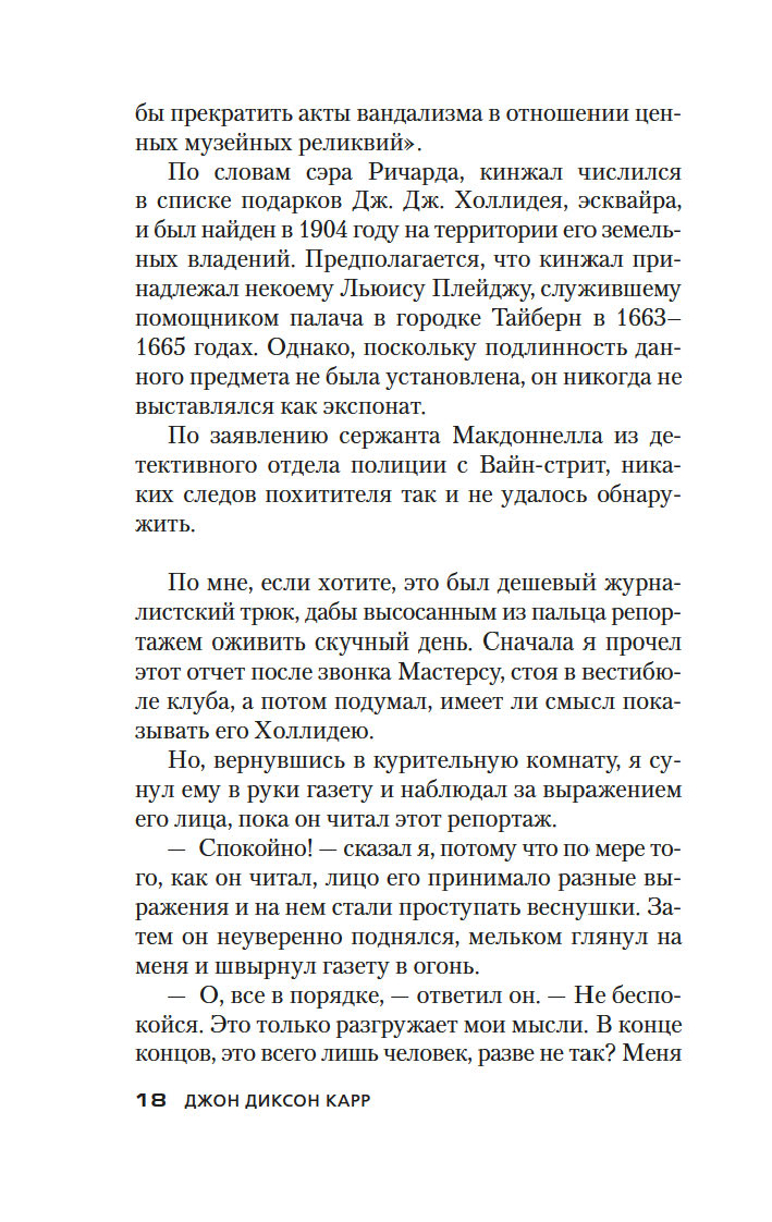 Золотой век детектива оставил немало звездных имен – А. Кристи, Г. К. Честертон, Г. Митчелл и др. В этой яркой плеяде Джон Диксон Карр (1906–1977) занимает самое почетное место. В произведениях Карра нет места бешеным погоням и перестрелкам, а круг подозреваемых максимально ограничен. Убийство в запертой комнате – излюбленный сюжет автора. Карр вовлекает читателя в сети обманных ходов, ложных подсказок и тонких намеков и предлагает принять участие в решении хитроумной головоломки, распутывая ниточки "невозможных" преступлений.