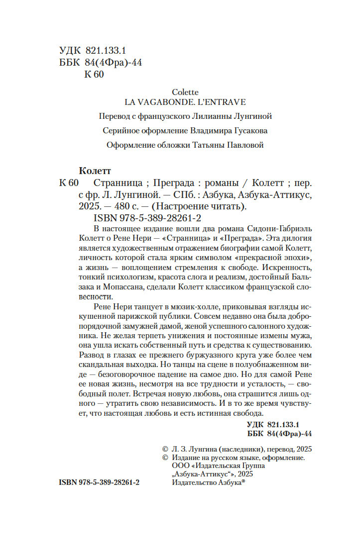 В настоящее издание вошли два романа Сидони-Габриэль Колетт о Рене Нери – "Странница" и "Преграда". Эта дилогия является художественным отражением биографии самой Колетт, личность которой стала ярким символом "прекрасной эпохи", а жизнь – воплощением стремления к свободе. Искренность, тонкий психологизм, красота слога и реализм, достойный Бальзака и Мопассана, сделали Колетт классиком французской словесности.