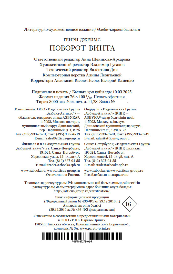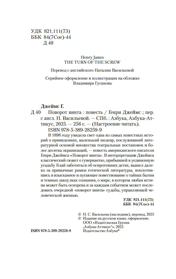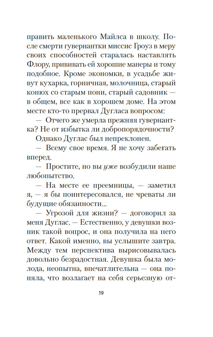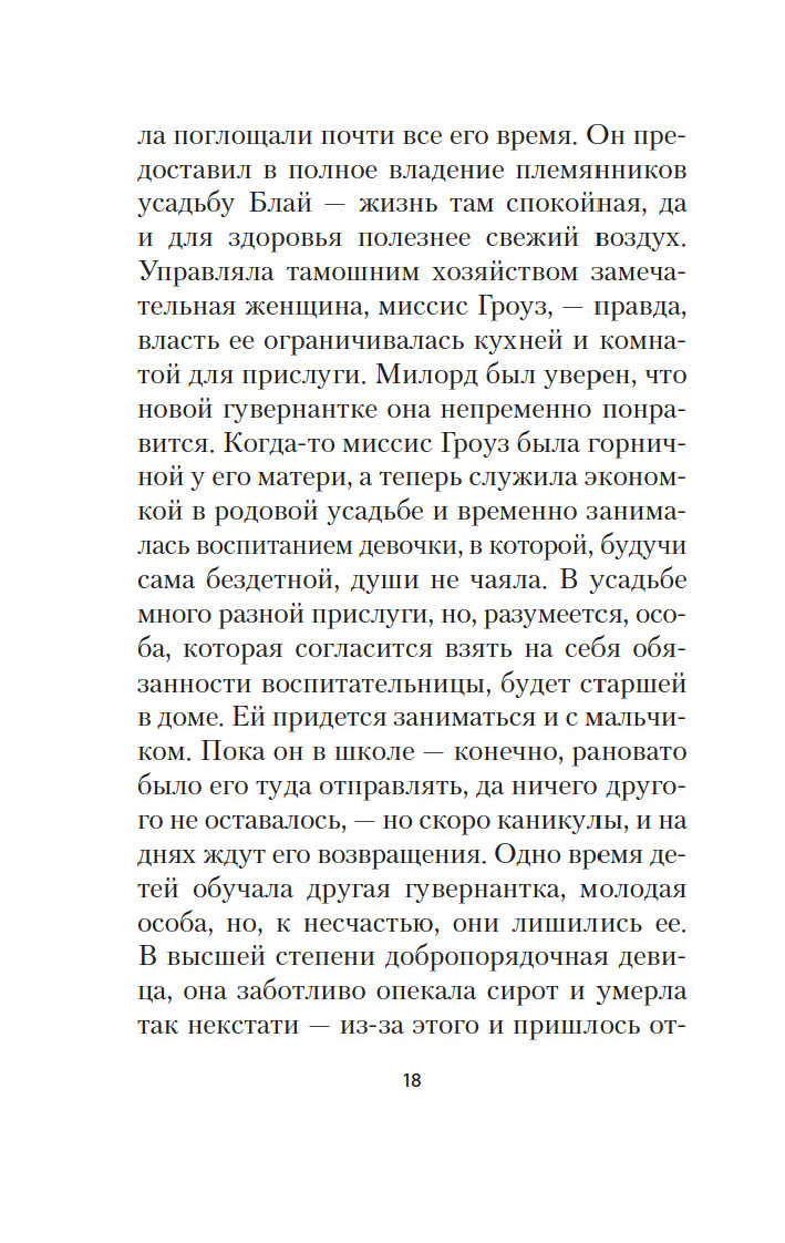 В 1898 году увидела свет одна из самых известных историй о привидениях, маленький шедевр, послуживший литературной основой множества театральных постановок и более десятка экранизаций, – повесть американского писателя Генри Джеймса "Поворот винта". В интерпретации Джеймса классический сюжет о гувернантке, прибывшей в уединенную усадьбу Блай заботиться об осиротевших детях, вышел далеко за привычные рамки готической литературы, воплотившись в изысканное и пугающее повествование о тайнах бытия и темных закоулках сознания, о мире, в котором любая истина может быть оспорена и за каждым событием может последовать очередной "поворот винта" судьбы, управляющей человеческой жизнью.