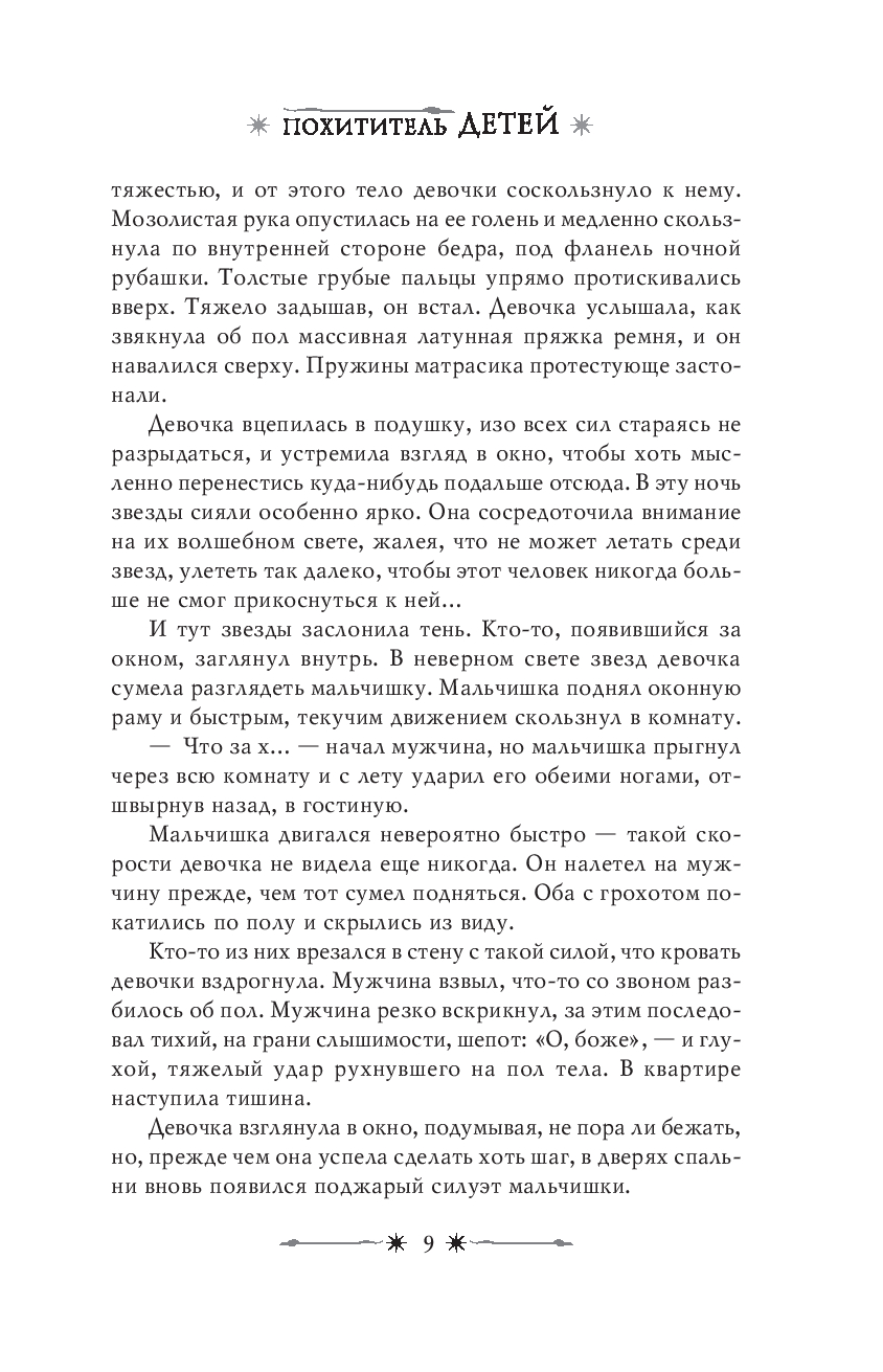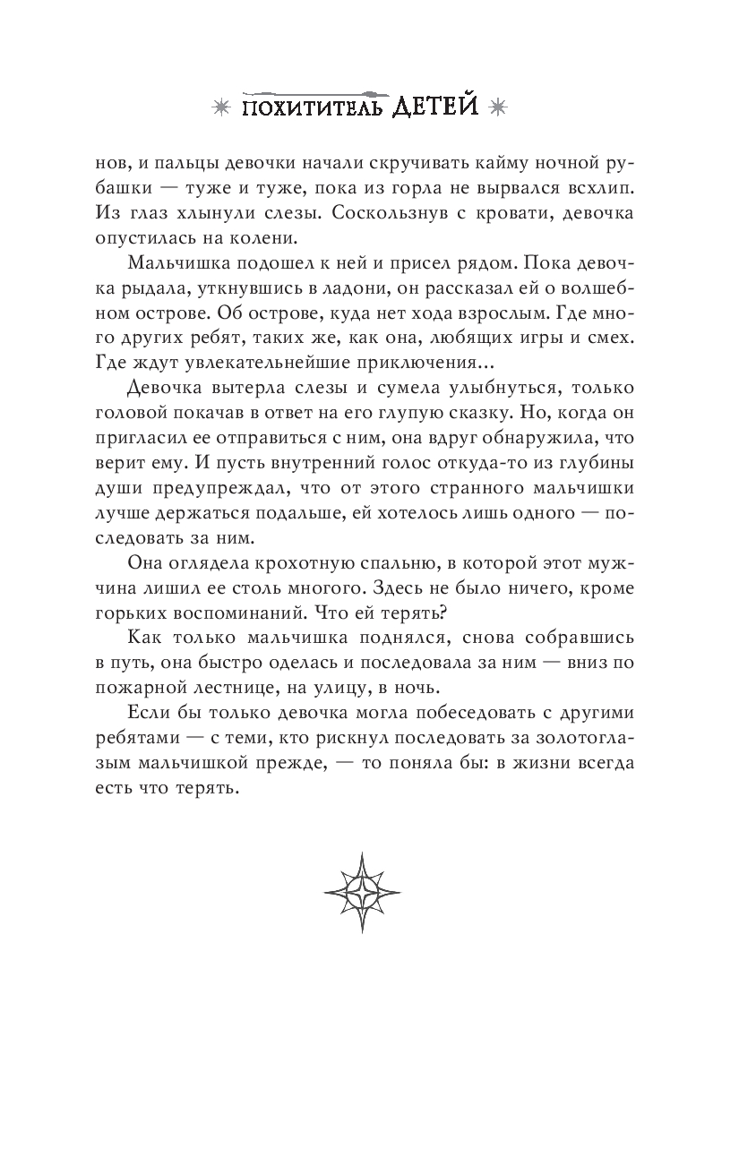 Четырнадцатилетний Ник чудом не погиб в одном из бруклинских парков от рук наркоторговцев, но на помощь ему явился Питер. О, этот Питер! Он быстр, смел, крайне проказлив и, как все мальчишки, любит поиграть, хотя его игры нередко заканчиваются кровопролитием. Его глаза сияют золотом; стоит ему улыбнуться вам, и вы превращаетесь в его друга на всю жизнь. Он приходит к одиноким пропащим детям – сломленным, отчаявшимся, подвергающимся насилию, – обещая взять их с собой в тайное место, где их ждут необычайные приключения, где живо волшебство и где они никогда не станут взрослыми. Конечно, безумные россказни Питера о феях и чудовищах настораживают, но Ник соглашается. В конце концов, в Нью-Йорке для него больше нет безопасного места. Что ему терять? Однако в жизни всегда есть что терять…