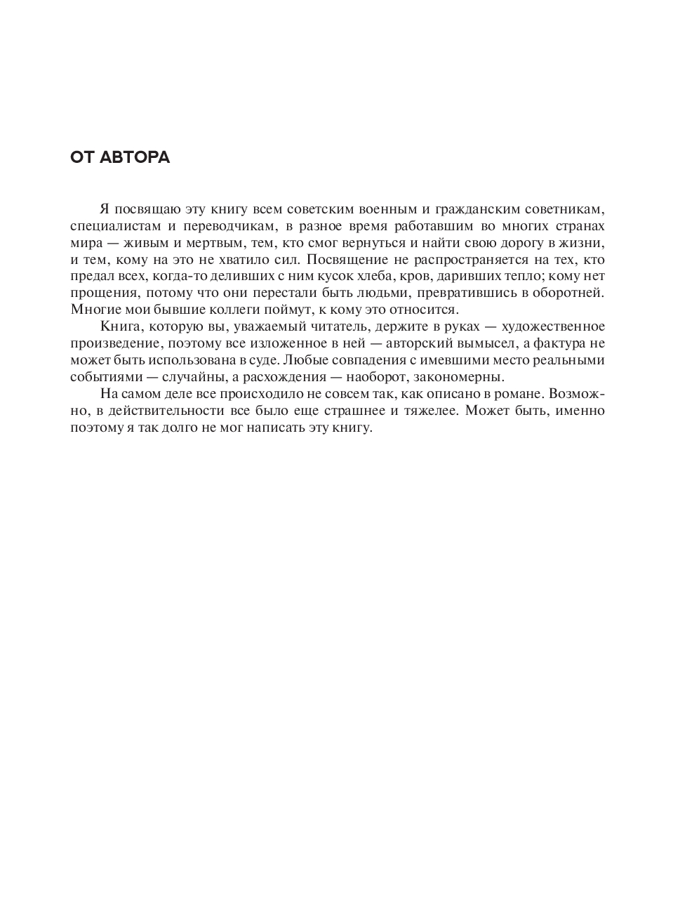 Я посвящаю эту книгу всем советским военным и гражданским советникам, специалистам и переводчикам, в разное время работавшим во многих странах мира – живым и мертвым, тем, кто смог вернуться и найти свою дорогу в жизни, и тем, кому на это не хватило сил. Посвящение не распространяется на тех, кто предал всех, когда-то деливших с ним кусок хлеба, кров, даривших тепло; кому нет прощения, потому что они перестали быть людьми, превратившись в оборотней. Многие мои бывшие коллеги поймут, к кому это относится.