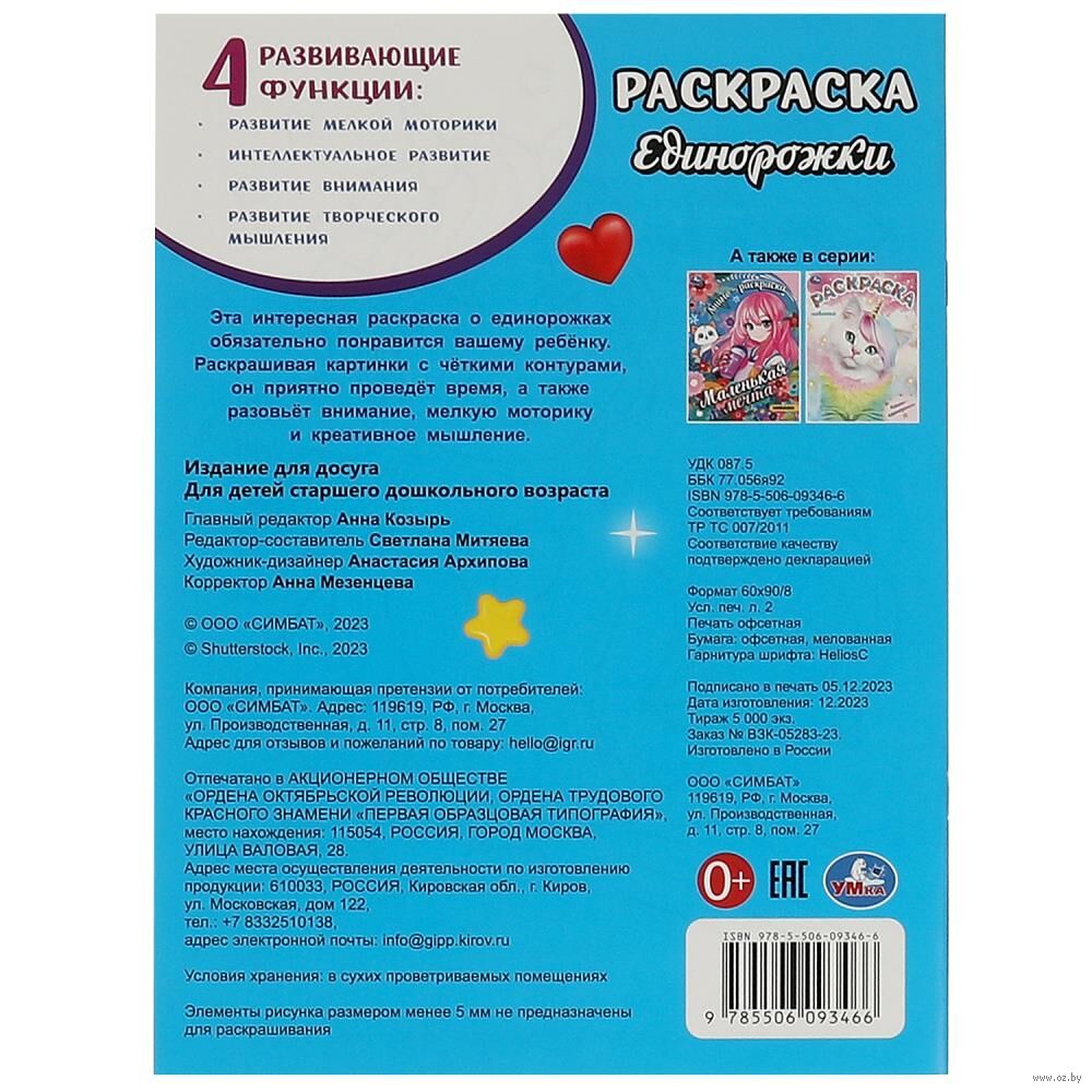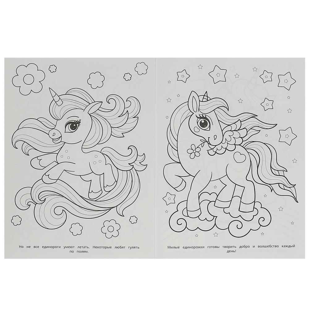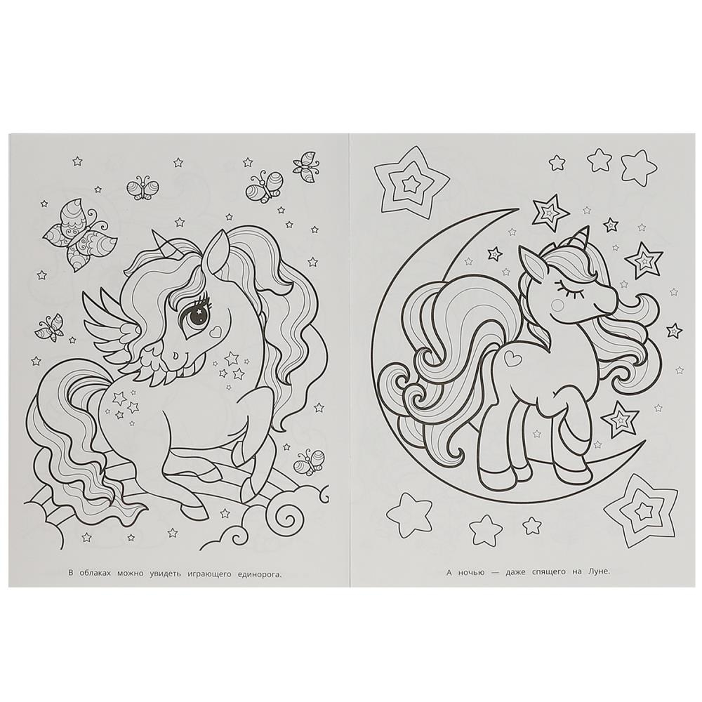 Эта увлекательная раскраска с очаровательными единорожками непременно понравится вашему ребёнку. В ней он найдёт интересные картинки с чёткими контурами и сюжетными текстами к ним. Благодаря удобному формату раскраску можно взять с собой в дорогу.