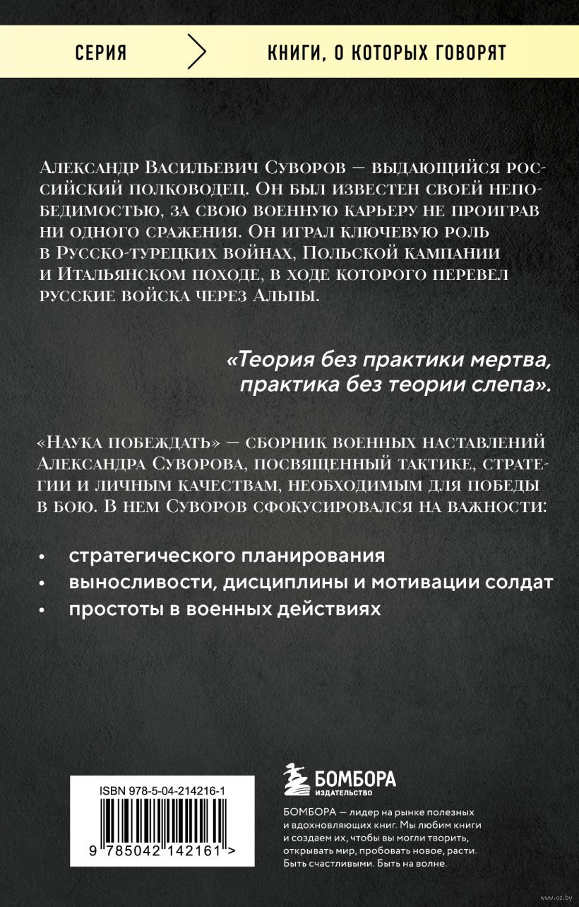"Наука побеждать" – это сборник военно-теоретических сочинений великого русского полководца Александра Васильевича Суворова. В этой книге Суворов делится своими принципами и методами ведения войны, основанными на богатом практическом опыте и многочисленных победах.