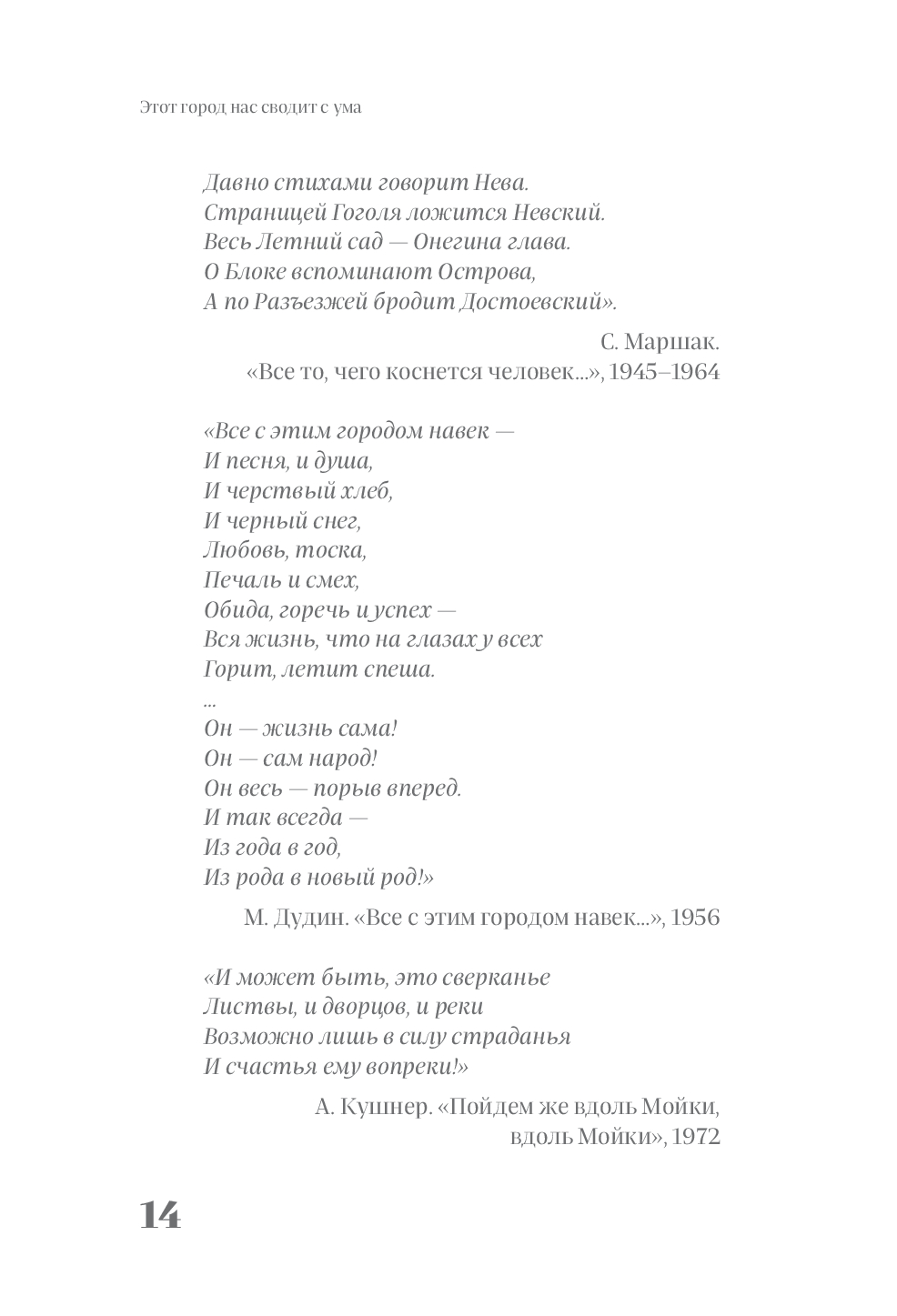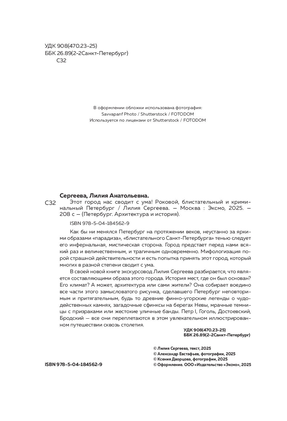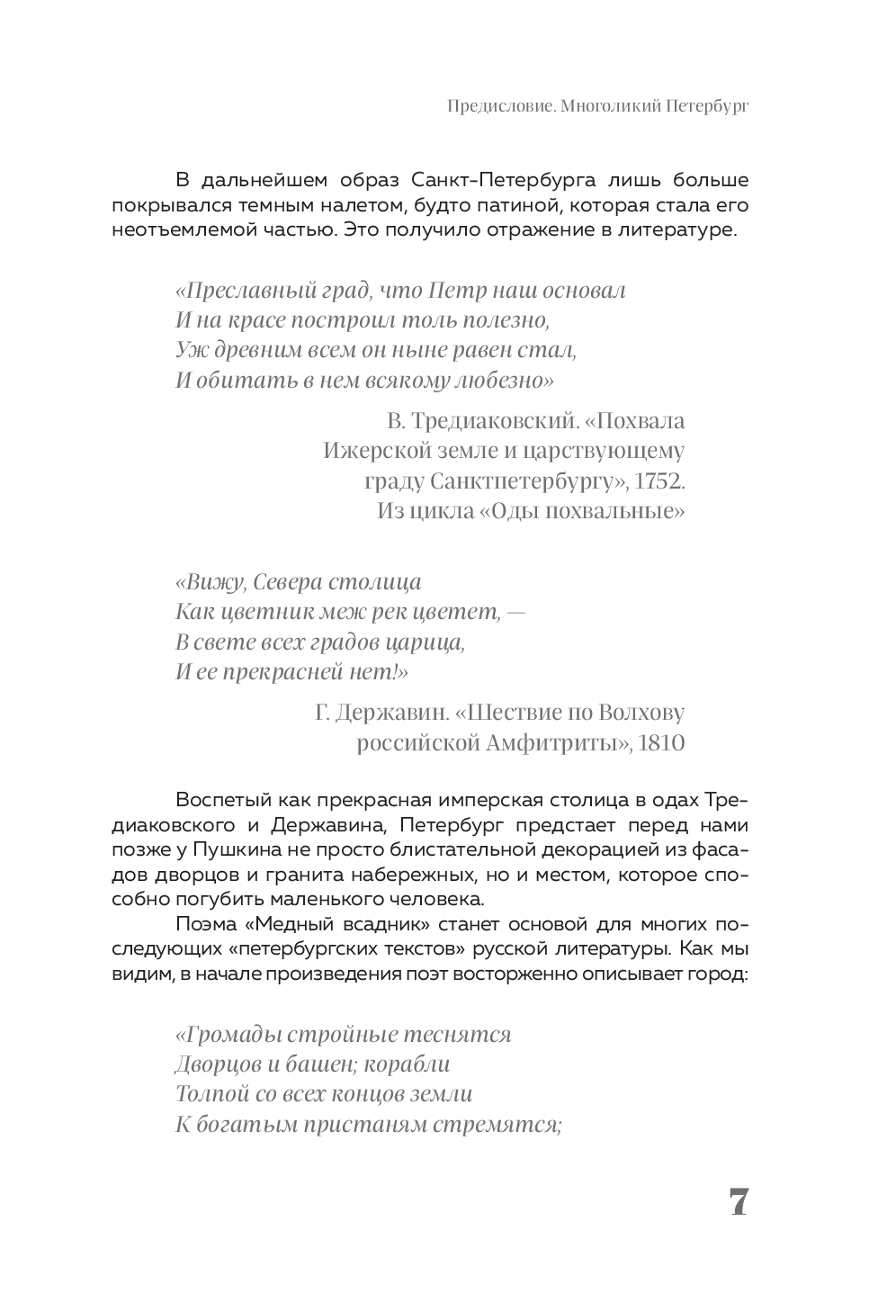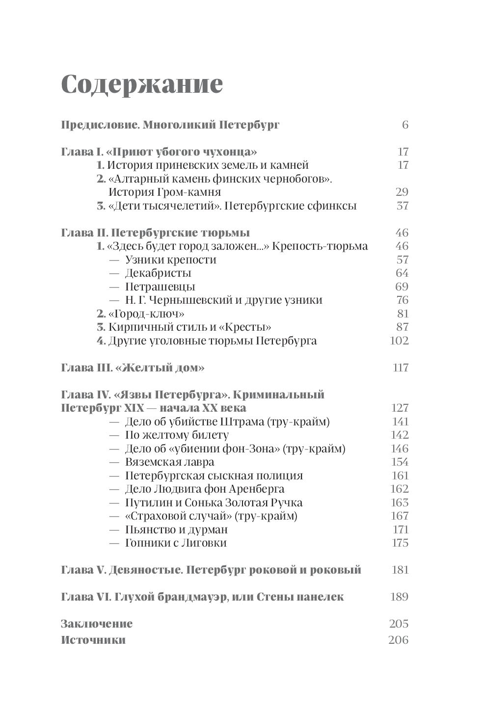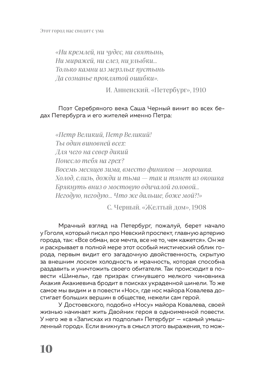 В своей новой книге экскурсовод Лилия Сергеева разбирается, что является составляющими образа этого города: история мест, где он был основан? Его климат? А, может, архитектура или сами жители? Она собирает воедино все части этого замысловатого рисунка, сделавшего Петербург неповторимым и притягательным, будь то древние фино-угорские легенды о чудодейственных камнях, загадочный сфинксы на берегах Невы, мрачные темницы с призраками или жестокие уличные банды. Пётр I, Гоголь, Достоевский, Бродский – все они переплетаются в этом увлекательном иллюстрированном путешествии сквозь столетия.