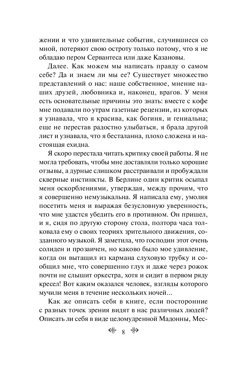 Книга Айседоры Дункан "Моя жизнь" – это яркая, откровенная и вдохновляющая автобиография одной из самых выдающихся танцовщиц XX века. В ней Айседора с удивительной искренностью рассказывает о своем пути: от непростого детства до всемирного признания, делится мыслями о свободе, искусстве и любви.