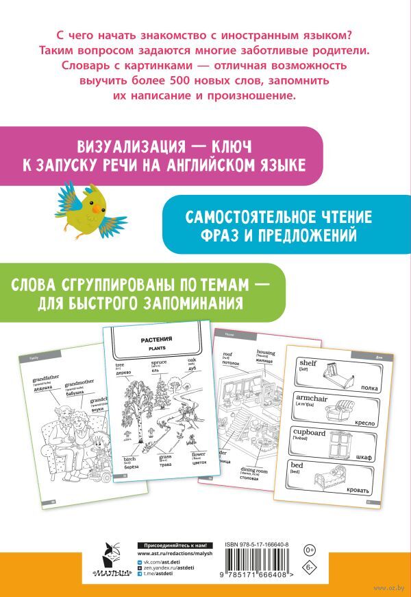 Наш визуальный словарик построен по тематическому принципу: можно изучать слова не отдельно, а группами – так у ребёнка зарождается интерес к языку, появляется мотивация к его освоению. Для каждого слова на английском – транскрипция + перевод + иллюстрация, это помогает сформировать ассоциации, тренирует зрительную память, обогащает словарный запас, развивает начальные навыки самостоятельного чтения на английском языке.