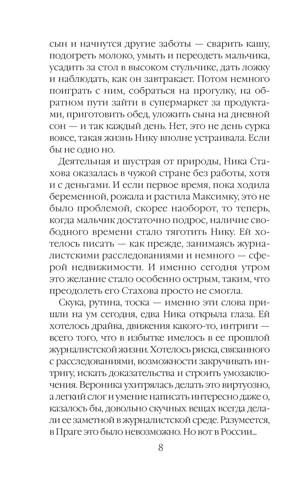 Журналистка Вероника Стахова спокойно жила в Праге со своим маленьким сыном Максимом. В какой-то момент она поняла, что очень скучает по своей работе, и попросила старого приятеля, Игоря Яблокова, найти ей место в каком-нибудь издании в Москве. Работа нашлась моментально, и Вероника приехала в столицу, полная радостных ожиданий, оставив Максимку на попечение друзей. Она отлично вписалась в коллектив и в творческий процесс, но тут Алексей Бальзанов, владелец компании, которой принадлежало интернет-издание, поручил ей расследовать смерть жены своего партнера Сергея Луцкого Натальи. С этого момента спокойная жизнь Стаховой закончилась: за ней кто-то постоянно следил, в квартиру влезли злоумышленники, на любимого мужчину напали... Вероника стала частенько задумываться: а стоило ли вообще возвращаться к работе?