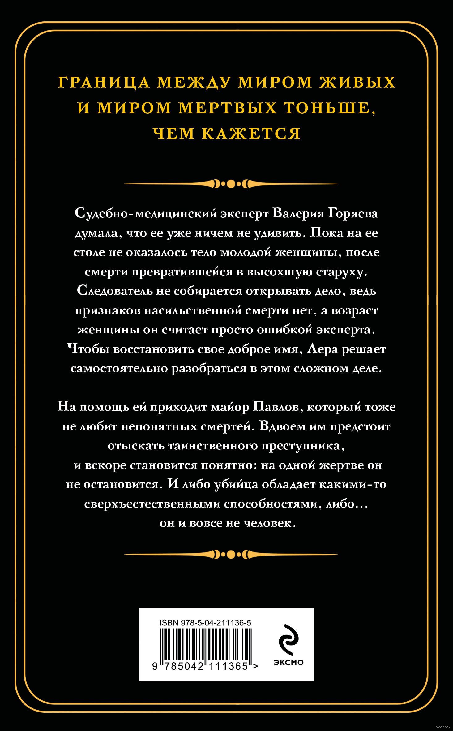 Судебно-медицинский эксперт Валерия Горяева думала, что ее уже ничем не удивить. Пока на ее столе не оказалось тело молодой женщины, после смерти превратившейся в высохшую старуху. Следователь не собирается открывать дело, ведь признаков насильственной смерти нет, а возраст женщины он считает просто ошибкой эксперта. Чтобы восстановить свое доброе имя, Лера решает самостоятельно разобраться в этом сложном деле.