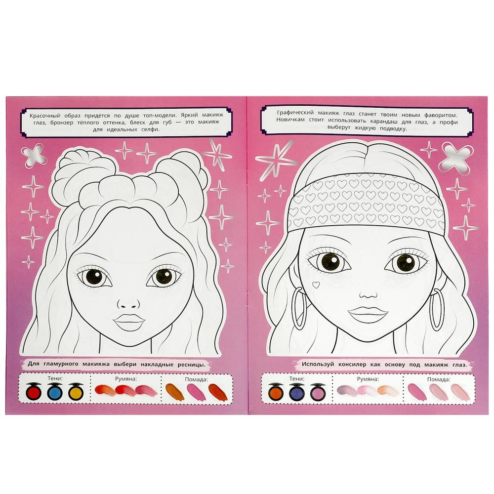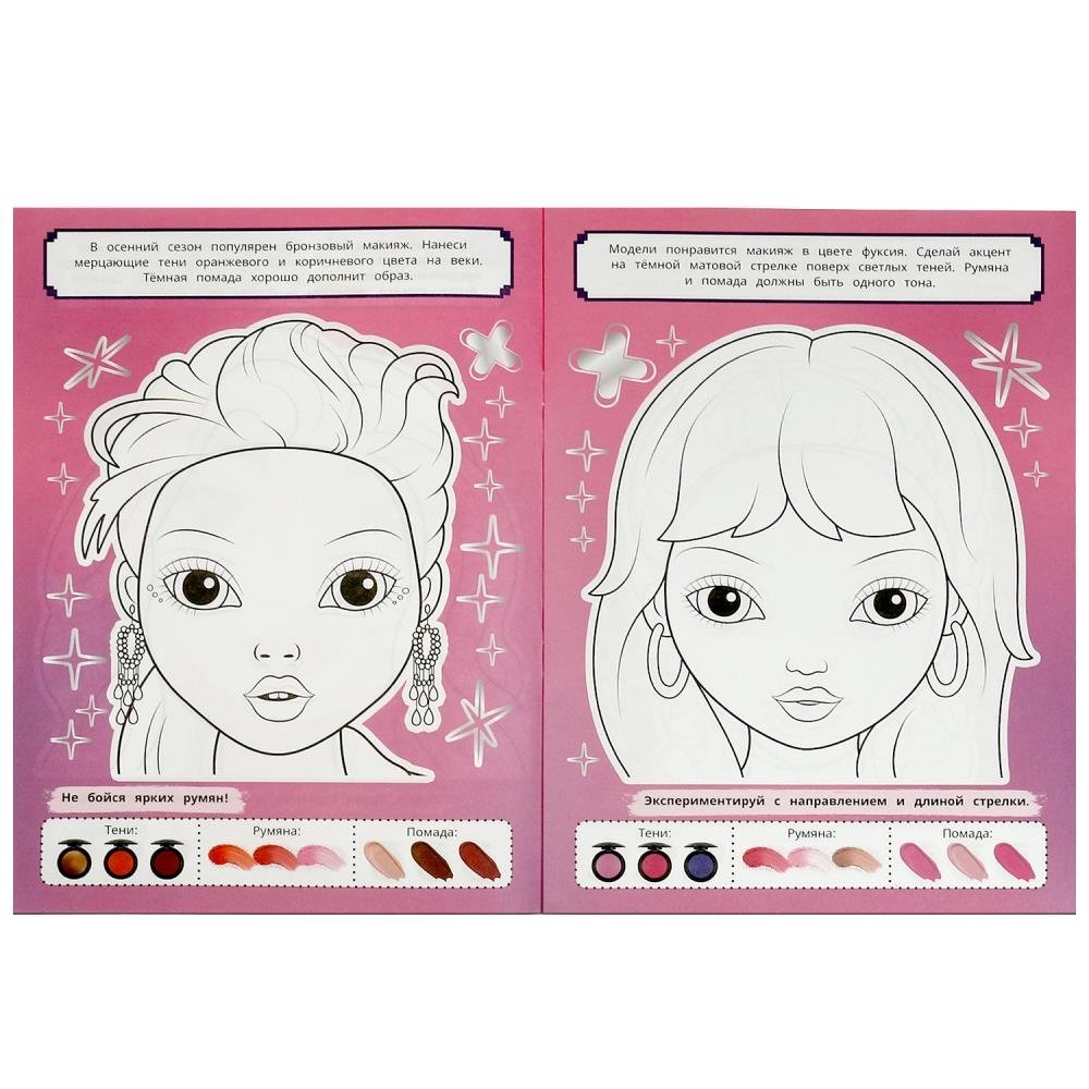 С помощью этой занимательной раскраски девочка почувствует себя настоящим визажистом и узнает секреты макияжа гламурных топ-моделей. Раскрашивание крупных чётких контуров не только дополнит досуг, но и поможет развить фантазию и мелкую моторику. Благодаря удобному формату раскраску можно взять с собой в дорогу.