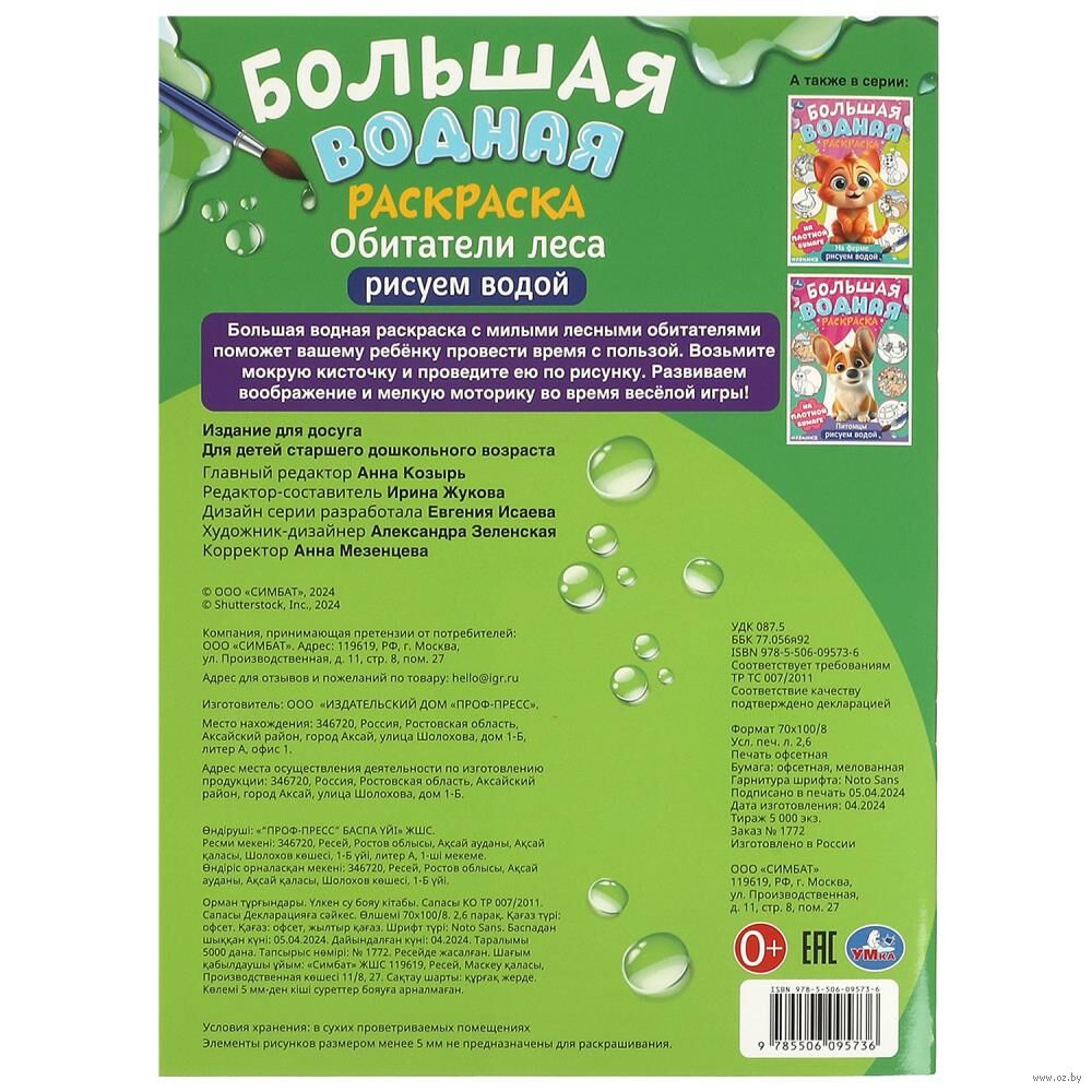 Водная раскраска скрасит досуг малыша и поможет раскрыть ему творческий потенциал. Для раскрашивания не понадобятся краски, карандаши или фломастеры – достаточно просто провести по рисунку мокрой кисточкой, чтобы он стал красочным и ярким. Крупные иллюстрации выполнены на плотной бумаге, что сделает процесс раскрашивания более удобным.