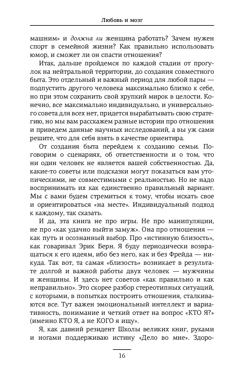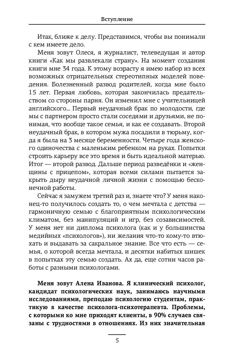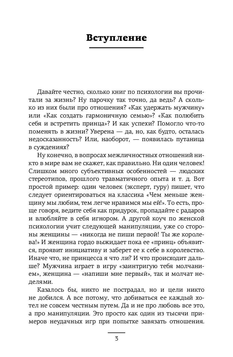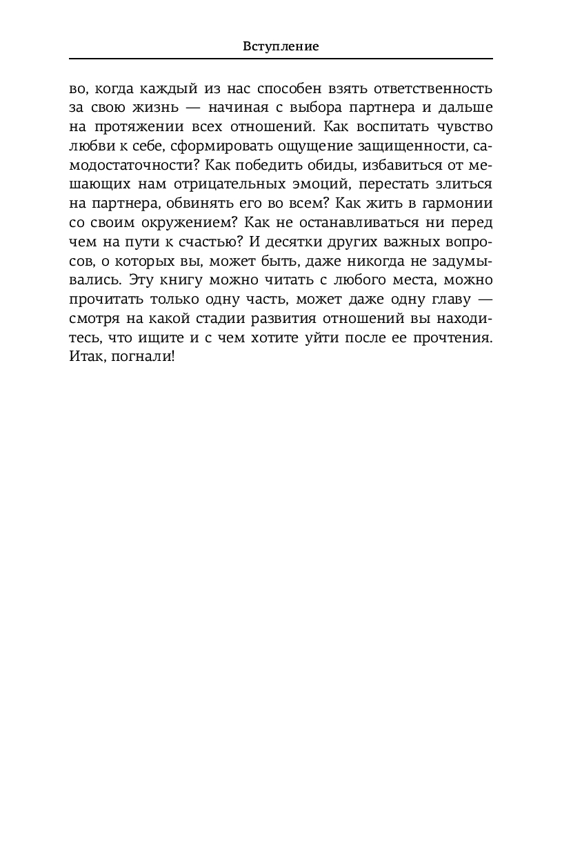 Вы узнаете о влиянии гормонов на влюбленность, почему спадают "розовые очки", как справиться с ревностью, общаться ли с бывшими, когда пора съезжаться и нужно ли варить борщи. Эта книга – не сборник готовых решений, а личный гид, помогающий понять отношения в их развитии, строить их осознанно и справляться с вызовами, не ограничивая себя стереотипами.