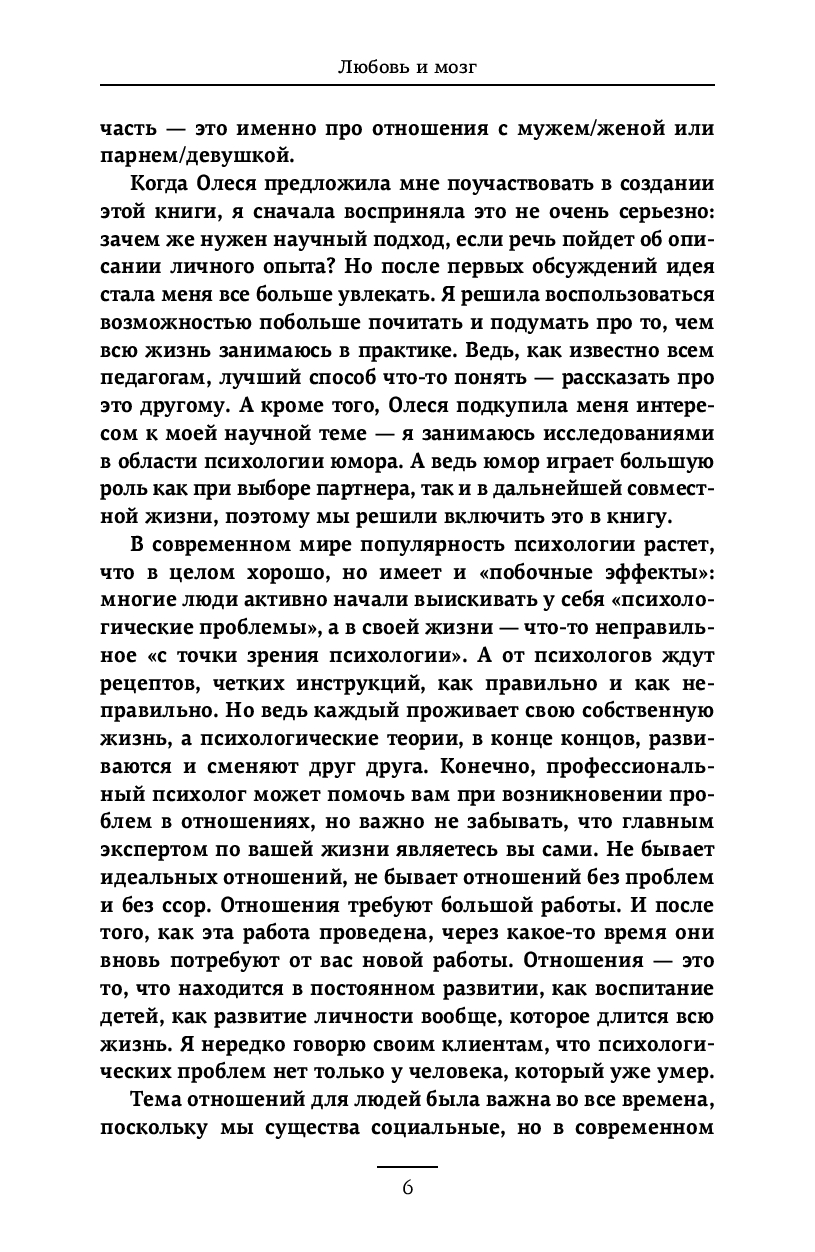 Книга, изначально задуманная с ироничным названием "Три брака – ни одного борща", основана на реальных событиях и родилась из личного опыта ошибок, кринжовых историй, браков, разводов, ссор, примирений и сложных поисков компромиссов. В конечном итоге, соединив современные научные исследования в области нейробиологии и психологии с многолетним опытом психотерапии, она преобразилась в глубокое исследование. Поэтому сейчас вы держите в руках книгу "Любовь и мозг", где авторы проанализировали этапы отношений с разных сторон.