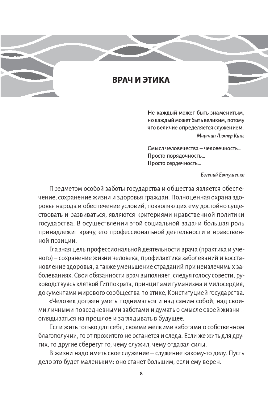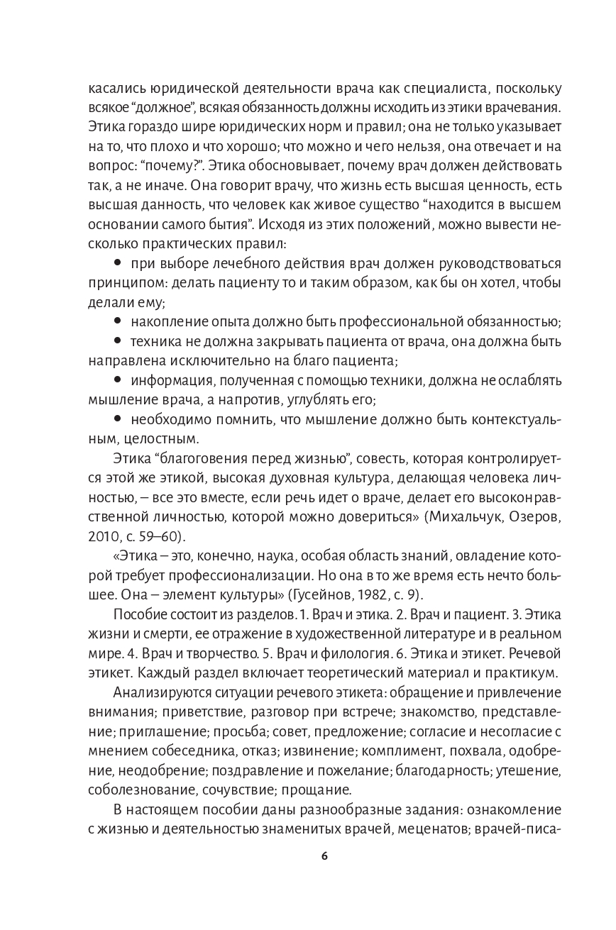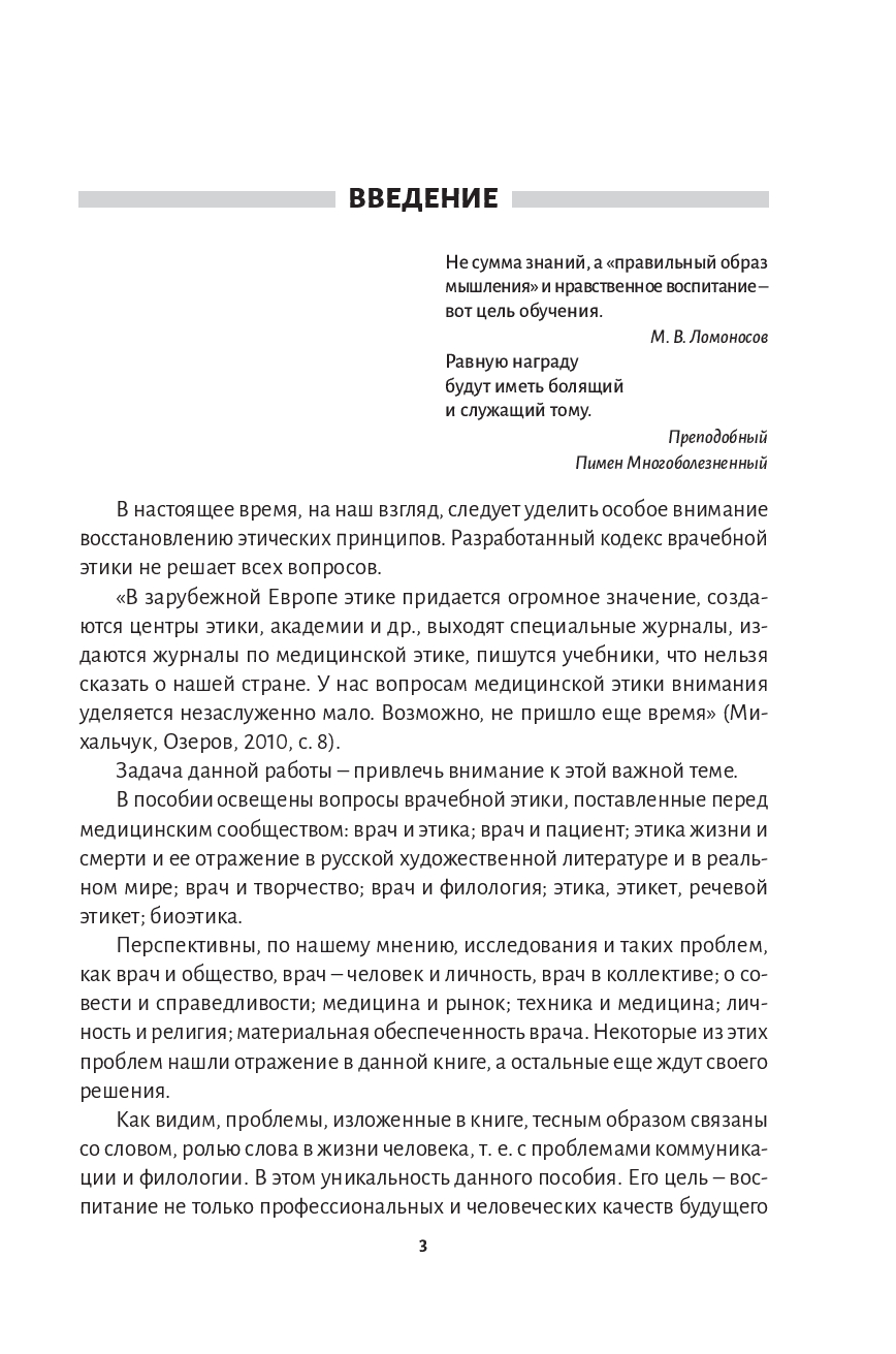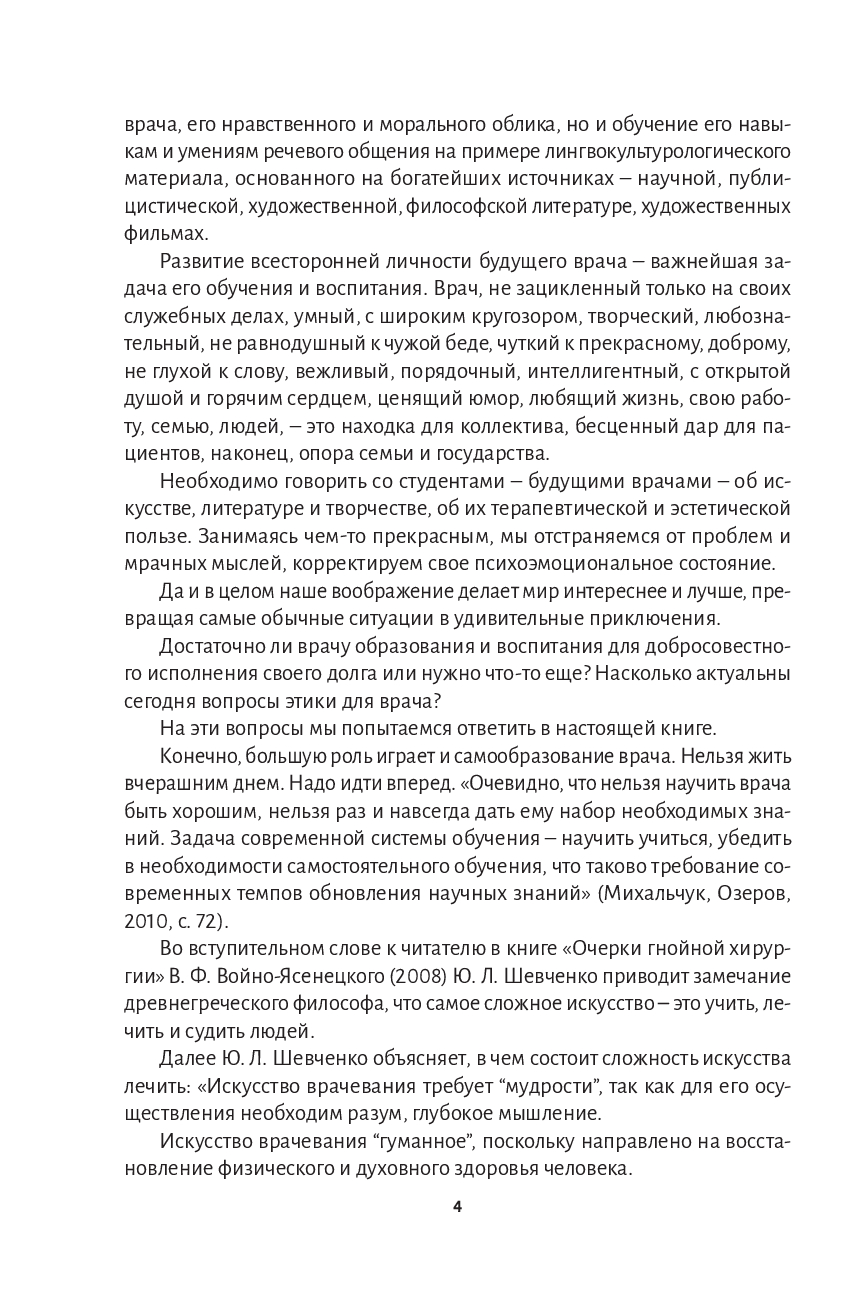 В учебном издании освещены вопросы врачебной этики, поставленные перед медицинским сообществом. Основная цель пособия – воспитание не только профессиональных, человеческих качеств будущего врача, его морального облика, но и обучение его навыкам и умениям речевого общения на примере лингвокультурологического материала, основанного на богатейших источниках – научной, философской, художественной литературе, публицистике и художественных фильмах.