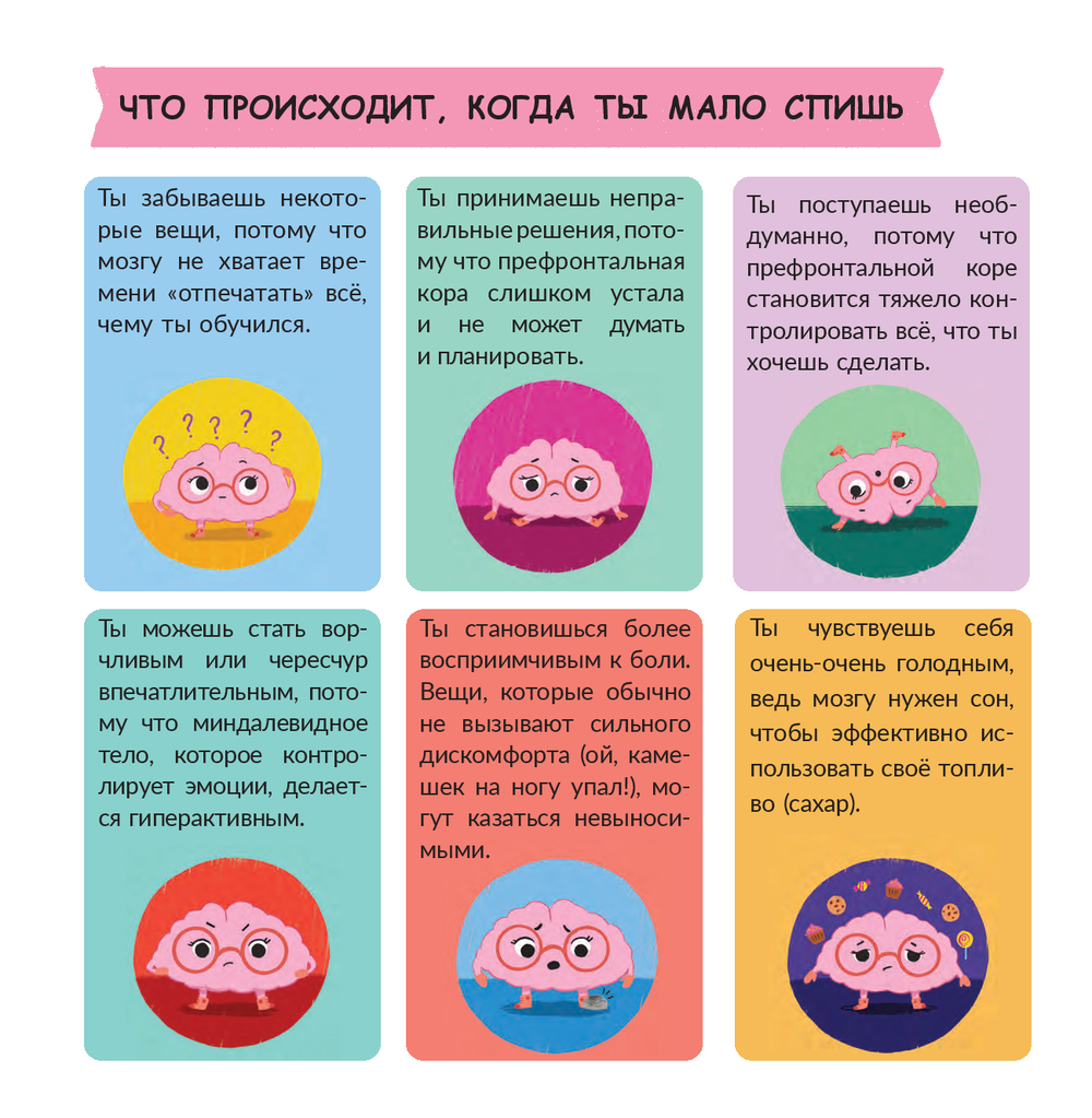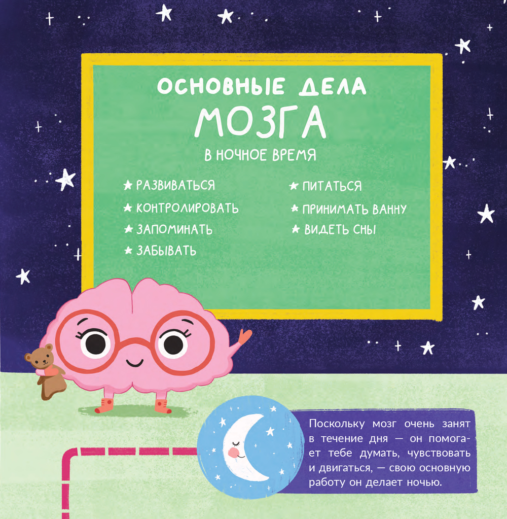 Целый день твой мозг очень занят: он помогает тебе есть, ходить, играть с друзьями и изучать что-то новое. Мозг трудится на протяжении всей жизни, а ты можешь помочь ему стать сильнее и эластичнее. Для этого вовремя ложись спать и хорошо высыпайся. Ведь пока ты спишь, мозг выполняет свою основную работу: