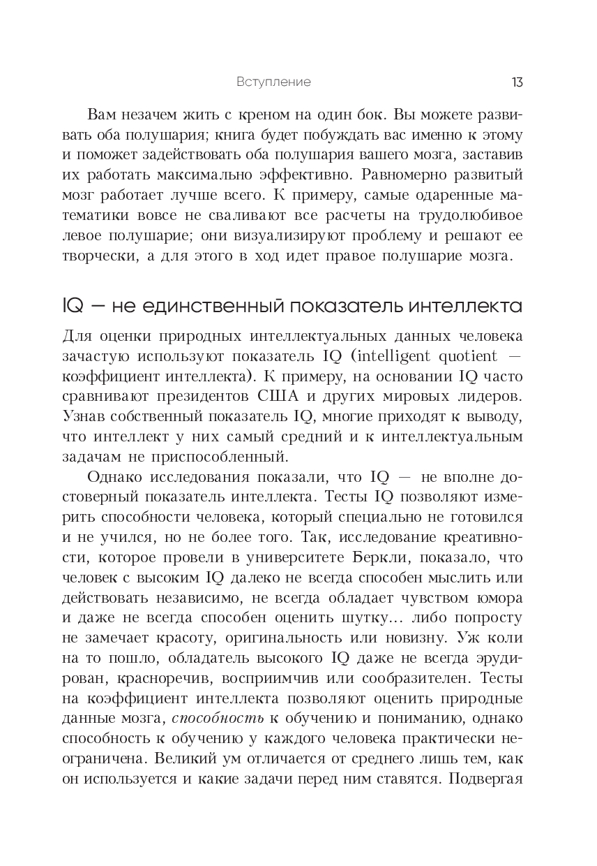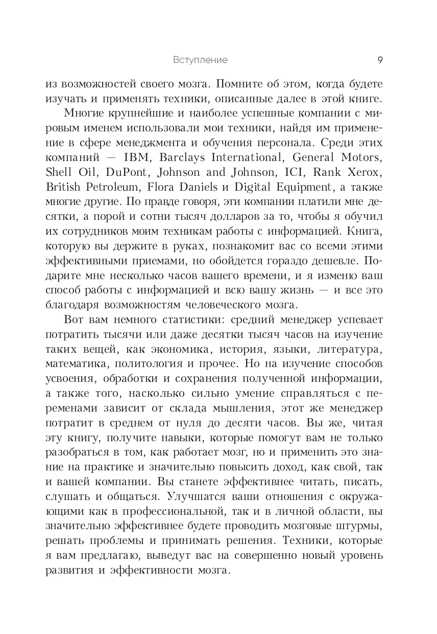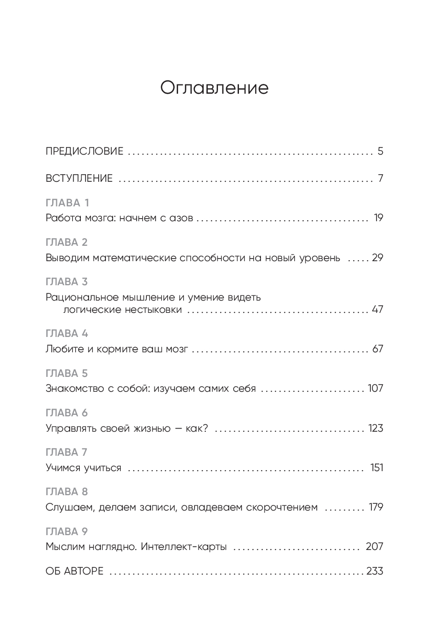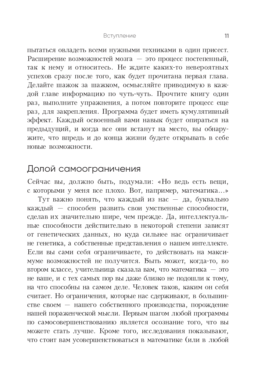 Книга представляет его авторские методики и техники, которые научат вас больше запоминать, мыслить четче и креативнее, решать сложные задачи, быстрее читать и эффективнее усваивать учебные материалы. Помимо прочего вы узнаете: