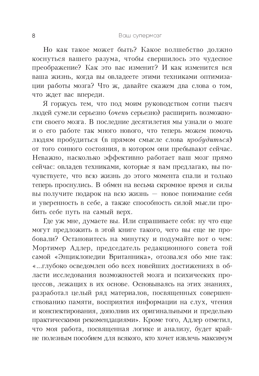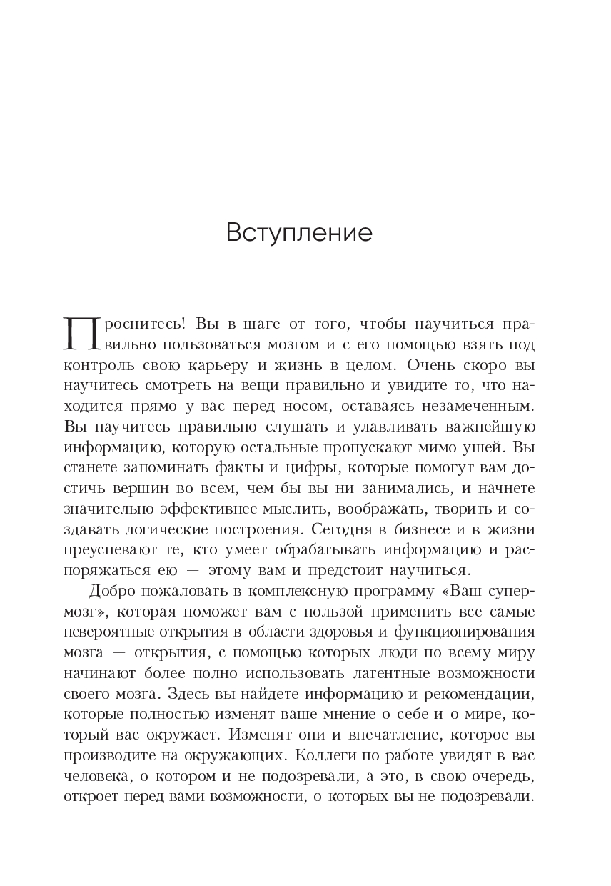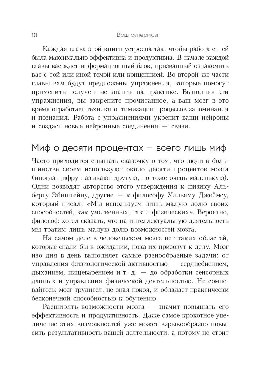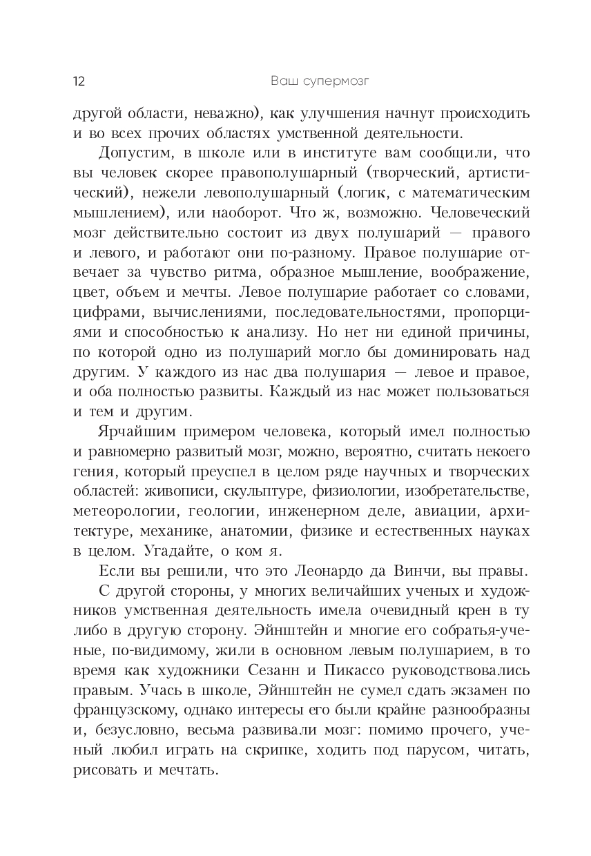 Книга представляет его авторские методики и техники, которые научат вас больше запоминать, мыслить четче и креативнее, решать сложные задачи, быстрее читать и эффективнее усваивать учебные материалы. Помимо прочего вы узнаете: