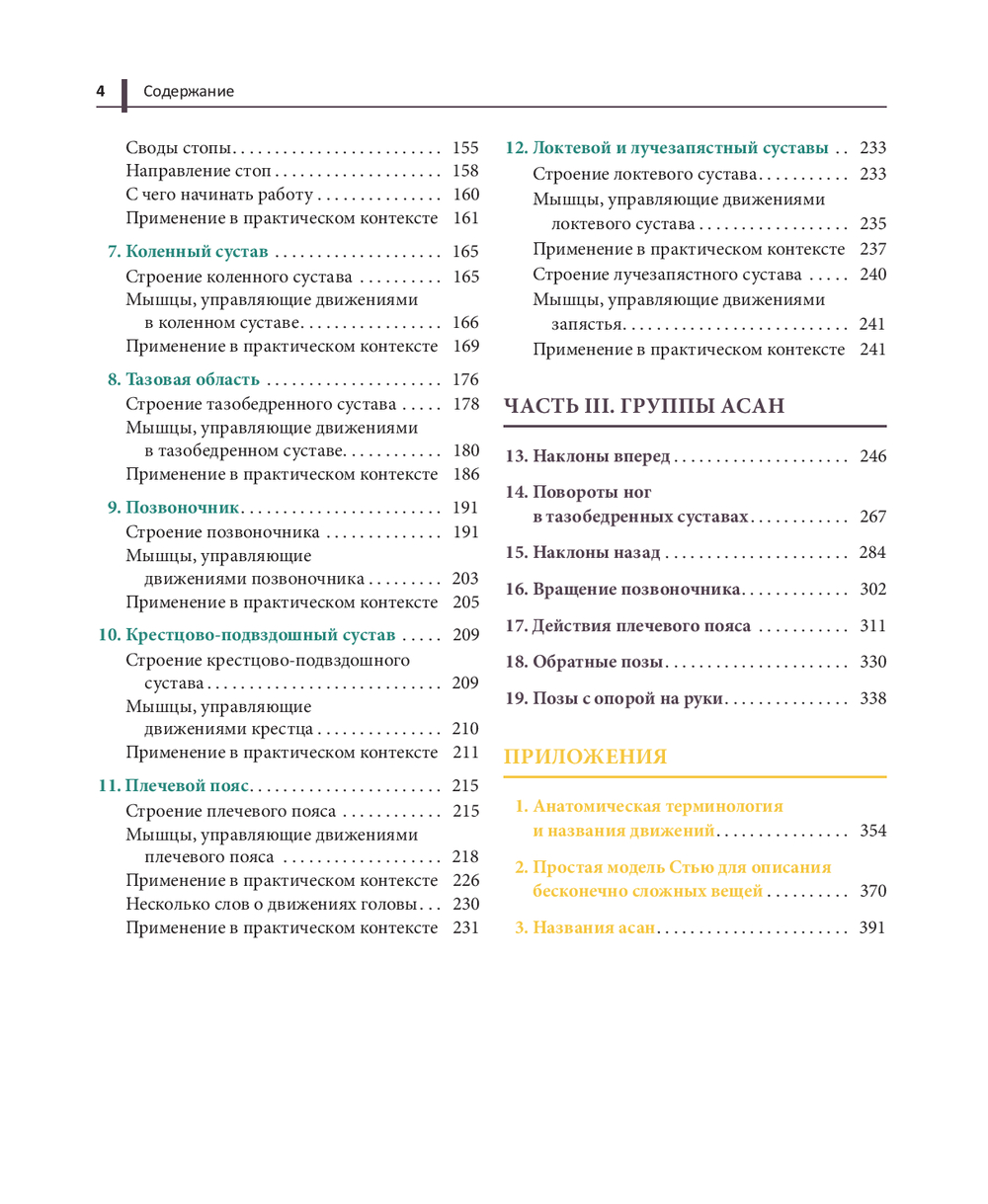 В книге просто и понятно разъясняются такие ключевые концепции анатомии йоги, как модели движений, разнообразие, дыхание, сила. Рисунки заставляют читателей почувствовать себя участниками действия и улыбнуться. Они отражают личный подход автора к практике и анатомии йоги. Весь теоретический материал демонстрируется на конкретных примерах и упражнениях, разбитых на следующие группы: