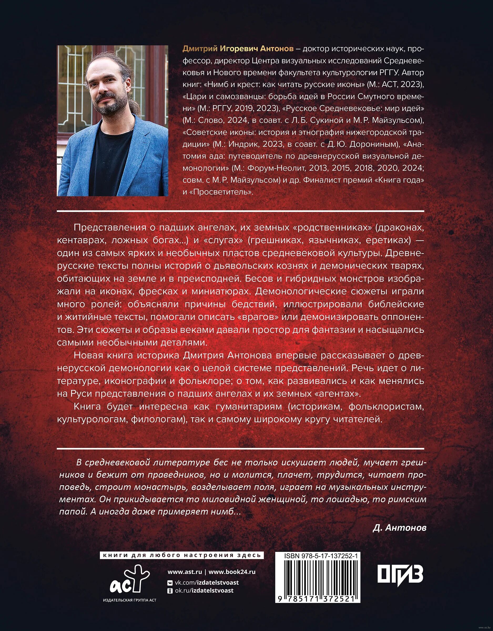 Новая книга историка Дмитрия Антонова впервые рассказывает о древнерусской демонологии как о целой системе представлений. Речь идет о литературе, иконографии и фольклоре; о том, как развивались и как менялись на Руси представления о падших ангелах и их земных "агентах".