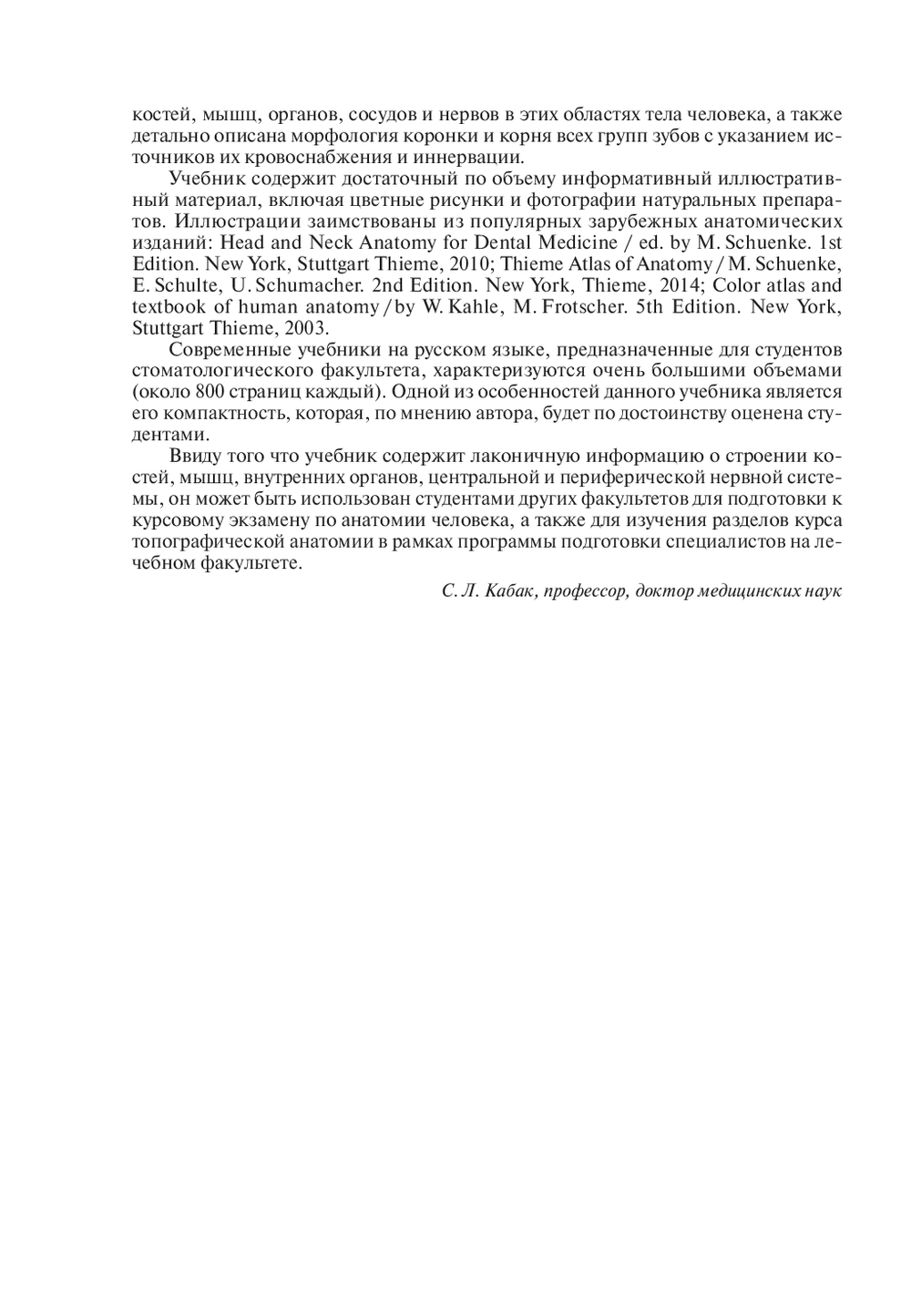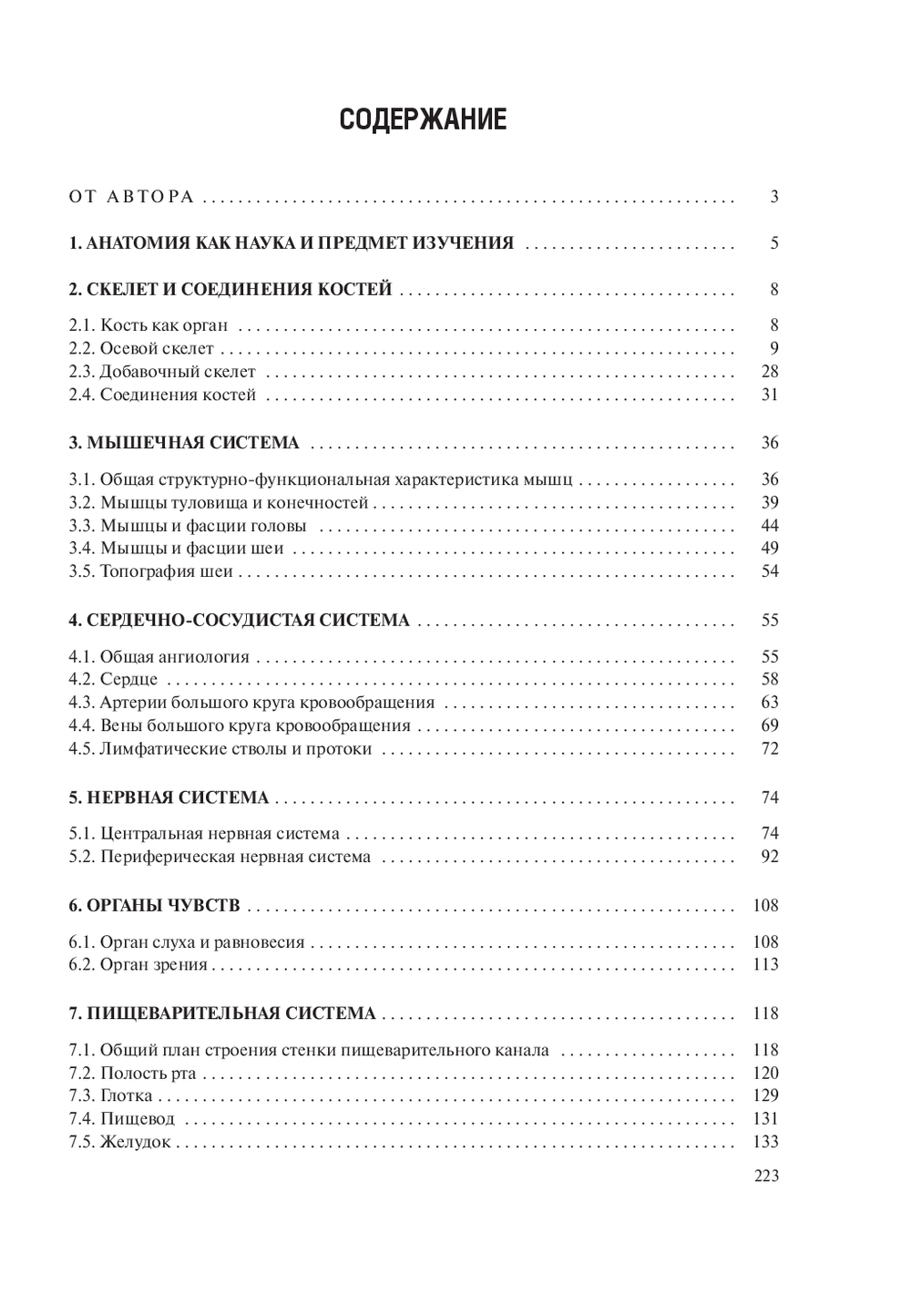 Излагаются современные концепции строения тела человека, в ряде случаев отличные от классических догм. Наряду с номенклатурными терминами даются их эпонимы, которые широко применяются в специальной литературе. Приводятся краткие примеры практического использования конкретных анатомических знаний. Две главы посвящены клинической анатомии головы и шеи, в которых рассматриваются топографо-анатомические взаимоотношения костей, мышц, органов, сосудов и нервов в этих областях тела человека, а также детально описана морфология коронки и корня всех групп зубов с указанием источников их кровоснабжения и иннервации.