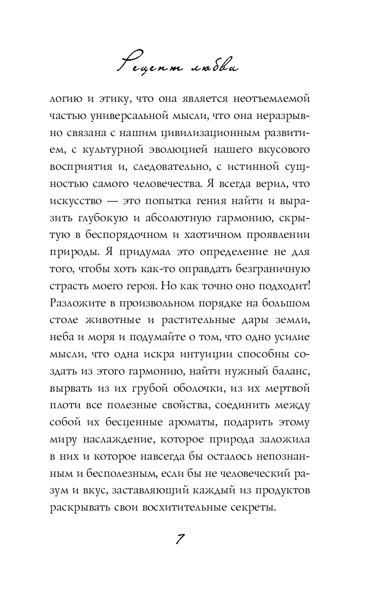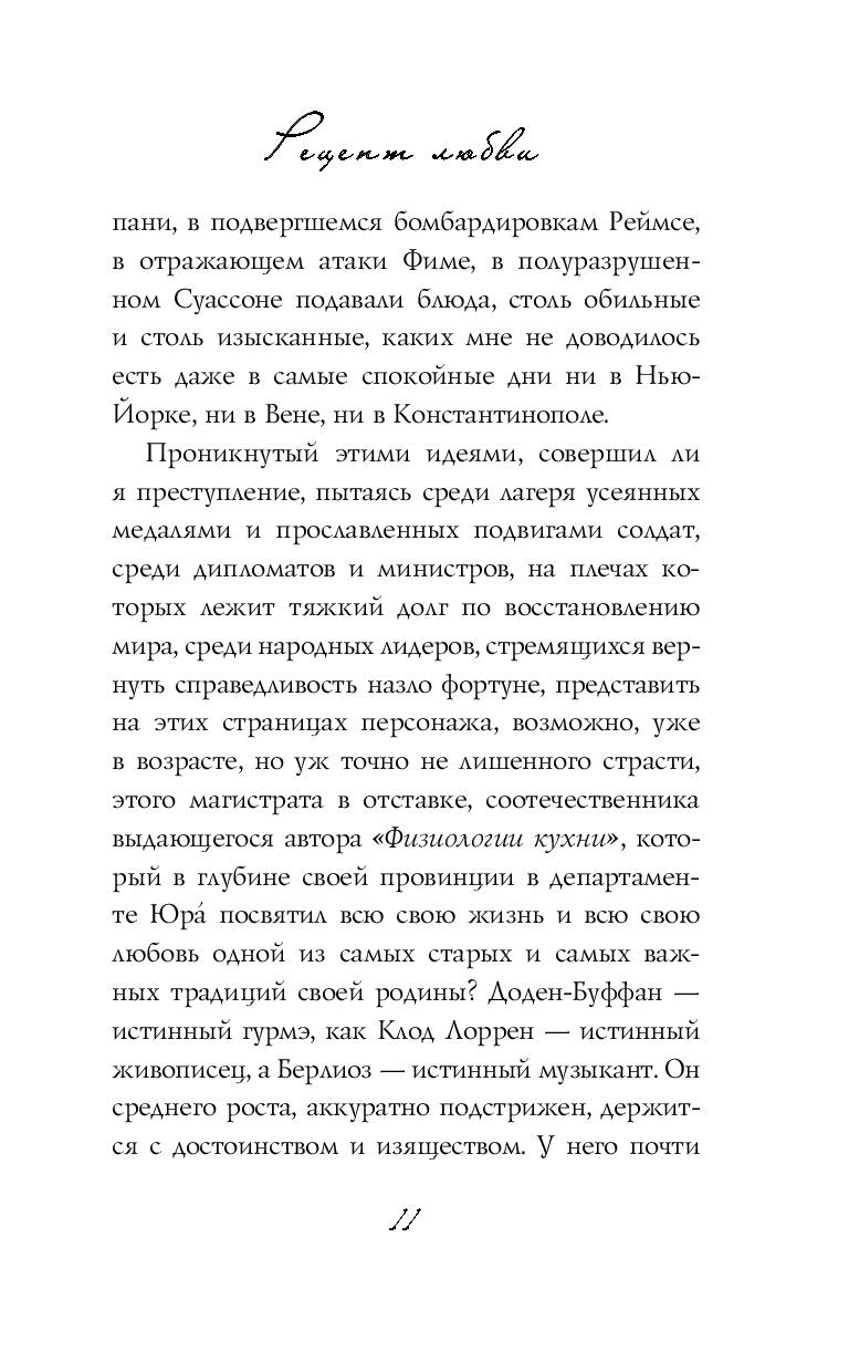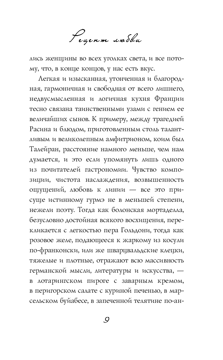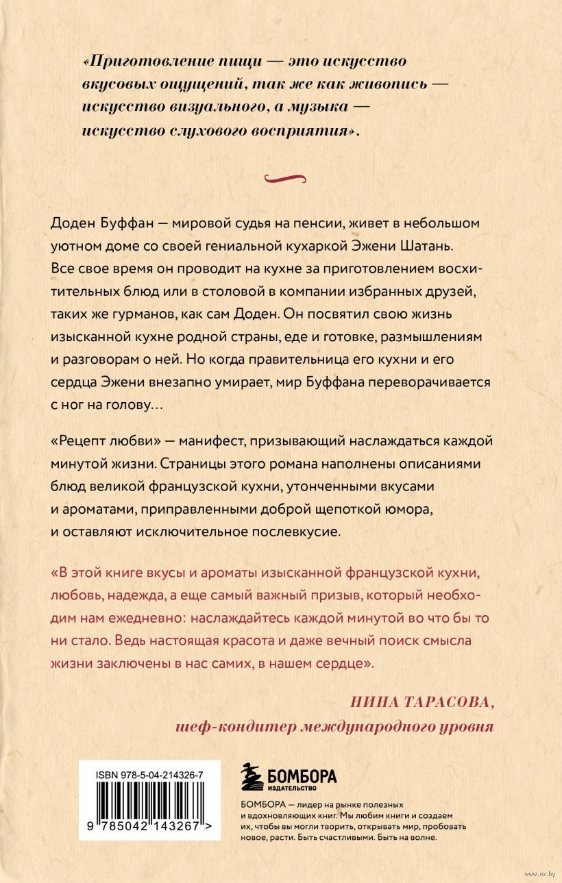 "Рецепт любви" – манифест, призывающий наслаждаться каждой минутой жизни. Страницы этого романа наполнены описаниями блюд великой французской кухни, утонченными вкусами и ароматами, приправленными доброй щепоткой юмора, и оставляют исключительное послевкусие.