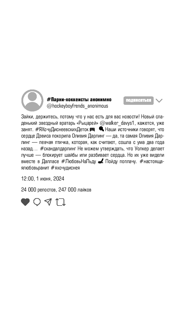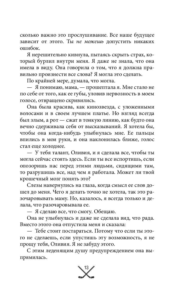 Моя работа – это сцена, а что до моей личной жизни… Она больше напоминает цирк. Я настоящая поп-сенсация, однако хочу лишь одного: вырваться из-под удушающего контроля и ощутить себя свободной хотя бы на одну ночь. Возможно именно поэтому я соглашаюсь провести ее с сексуальным хоккеистом, который умудряется свести меня с ума одним только взглядом. Вратарь-суперзвезда Уолкер "Дисней" Дэвис выглядит как Прекрасный принц, но за миловидной внешностью скрывается парень, готовый на все, чтобы получить желаемое. Даже если ради достижения цели придется пересечь несколько границ… Уолкер следует за мной повсюду и продолжает твердить, что я – его единственная. Эта чрезмерная увлеченность должна была заставить меня бежать, но я лишь тянусь к нему все сильнее. Стоит быть особенно осторожной, ведь в неправильной сказке даже принц может оказаться злодеем.