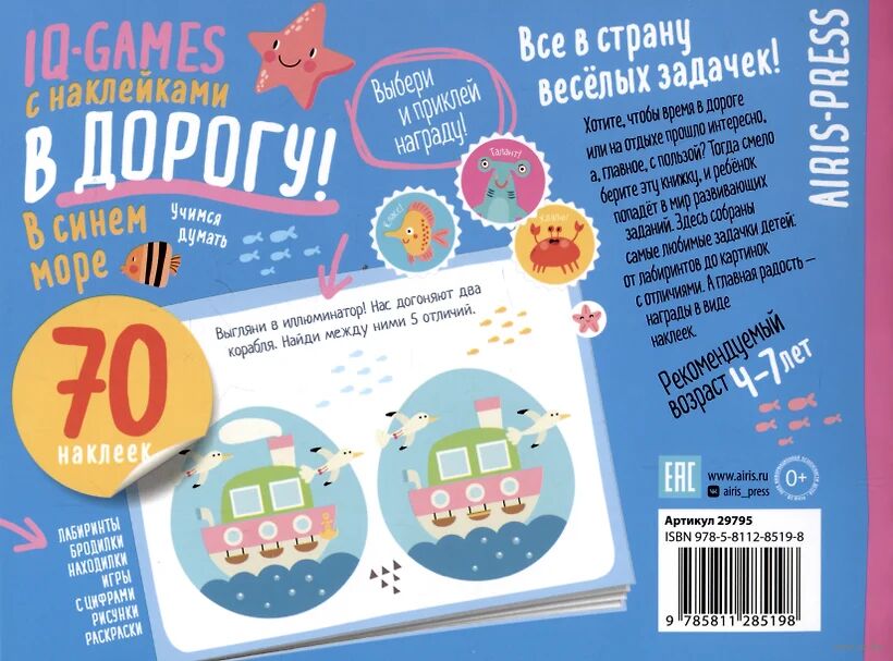 Пособие включает в себя 70 наклеек и весёлые задания для тренировки мышления. Ребёнка ждут запутанные лабиринты, игры с цифрами, картинки с отличиями, магические квадраты, раскраски. За каждое выполненное задание ребёнок получает награду – яркую наклейку. Он сам выбирает понравившуюся картинку и приклеивает на страничку.