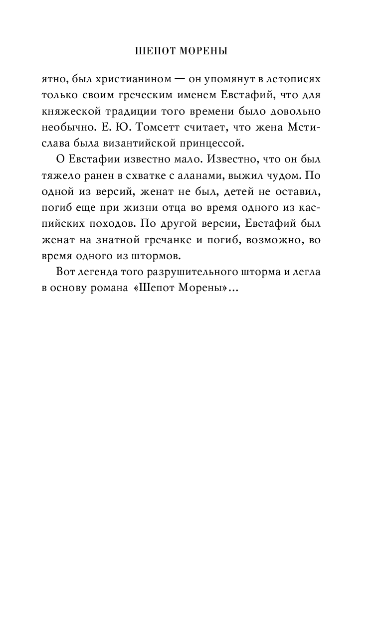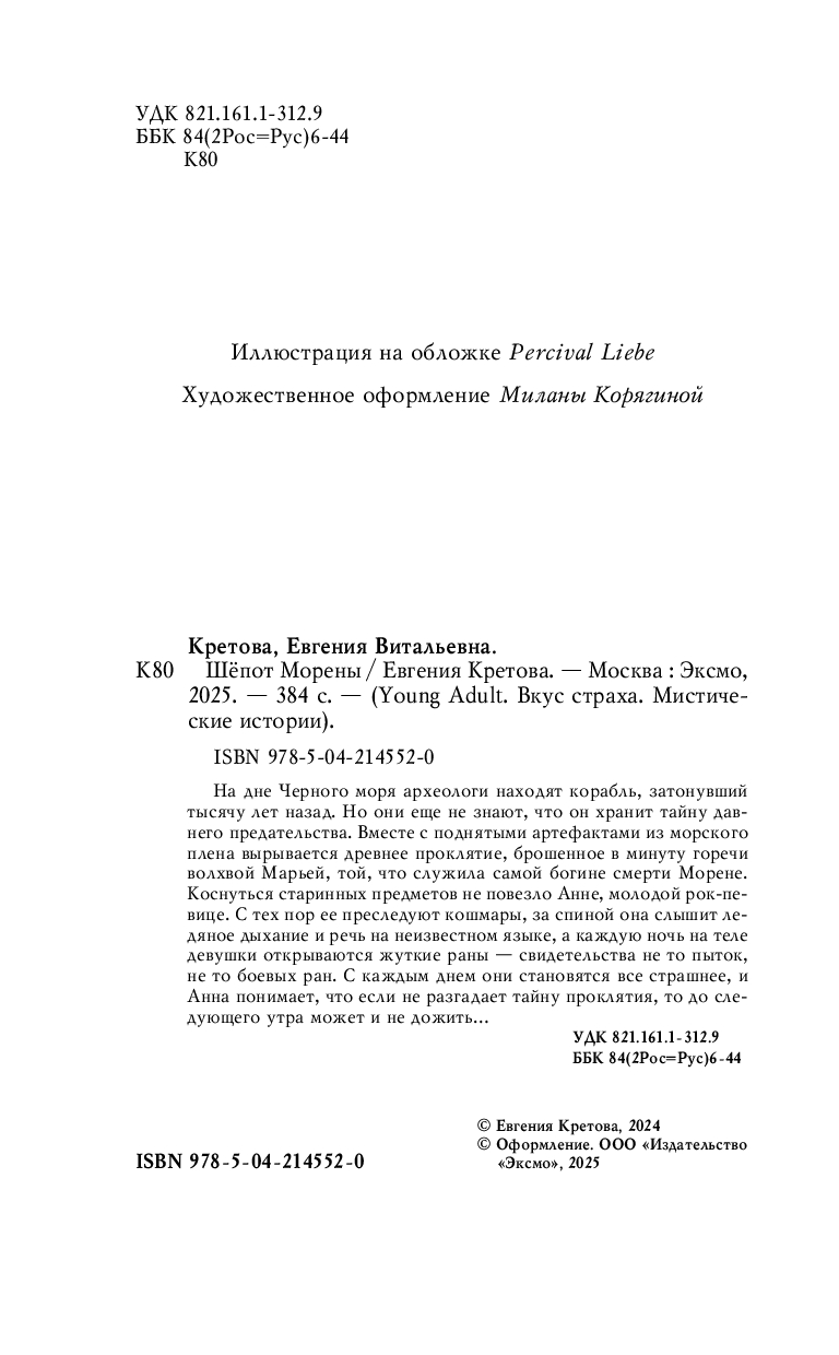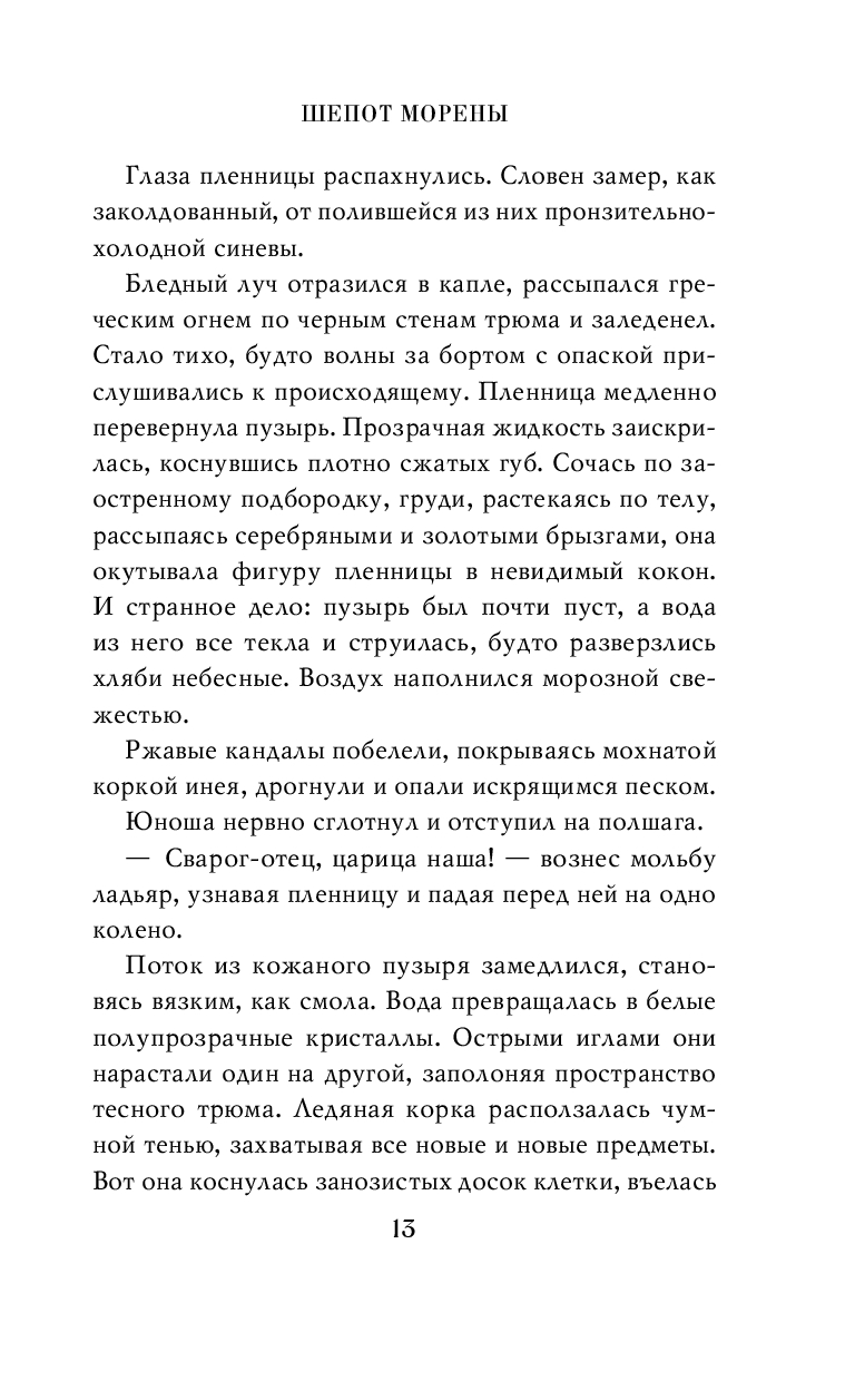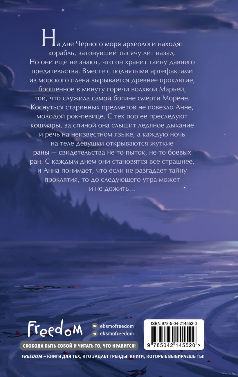 На дне Черного моря археологи находят корабль, затонувший тысячу лет назад. Но они еще не знают, что он хранит тайну давнего предательства. Вместе с поднятыми артефактами из морского плена вырывается древнее проклятие, брошенное в минуту горечи волхвой Марьей, той, что служила самой богине смерти Морене. Коснуться старинных предметов не повезло Анне, молодой рок-певице. С тех пор ее преследуют кошмары, за спиной она слышит ледяное дыхание и речь на неизвестном языке, а каждую ночь на теле девушки открываются жуткие раны – свидетельства не то пыток, не то боевых ран. С каждым днем они становятся все страшнее, и Анна понимает, что если не разгадает тайну проклятия, то до следующего утра может и не дожить…