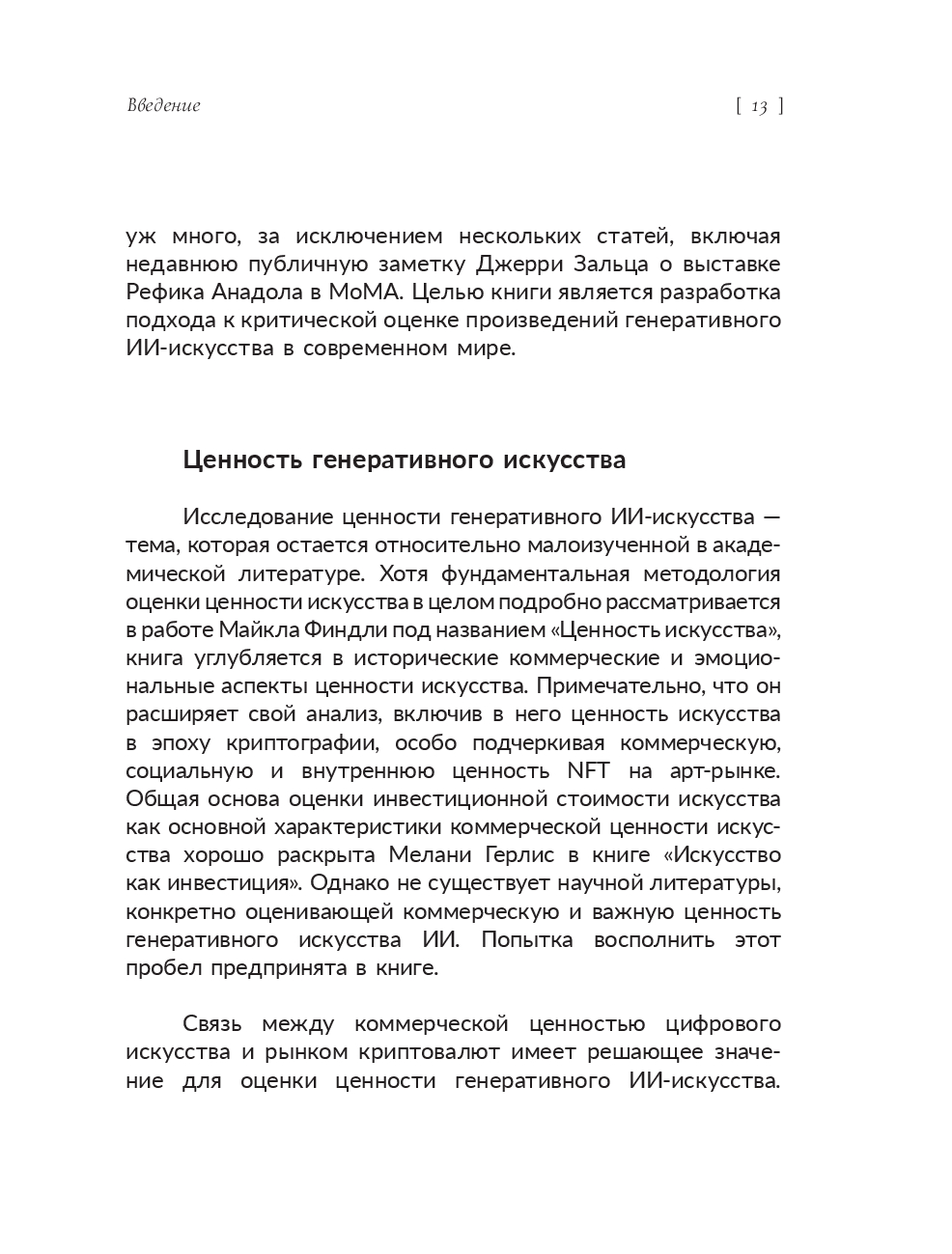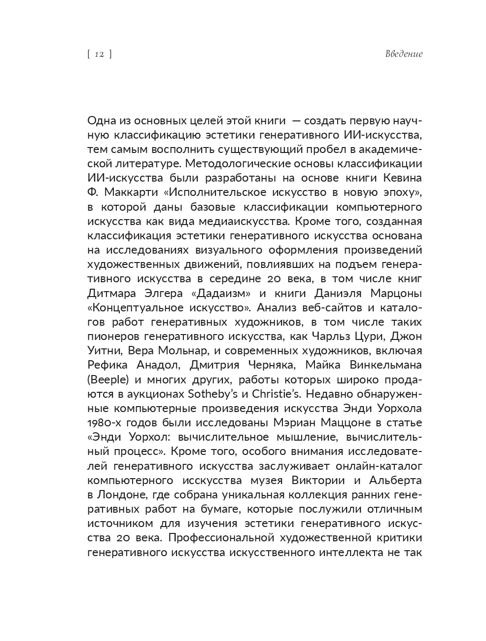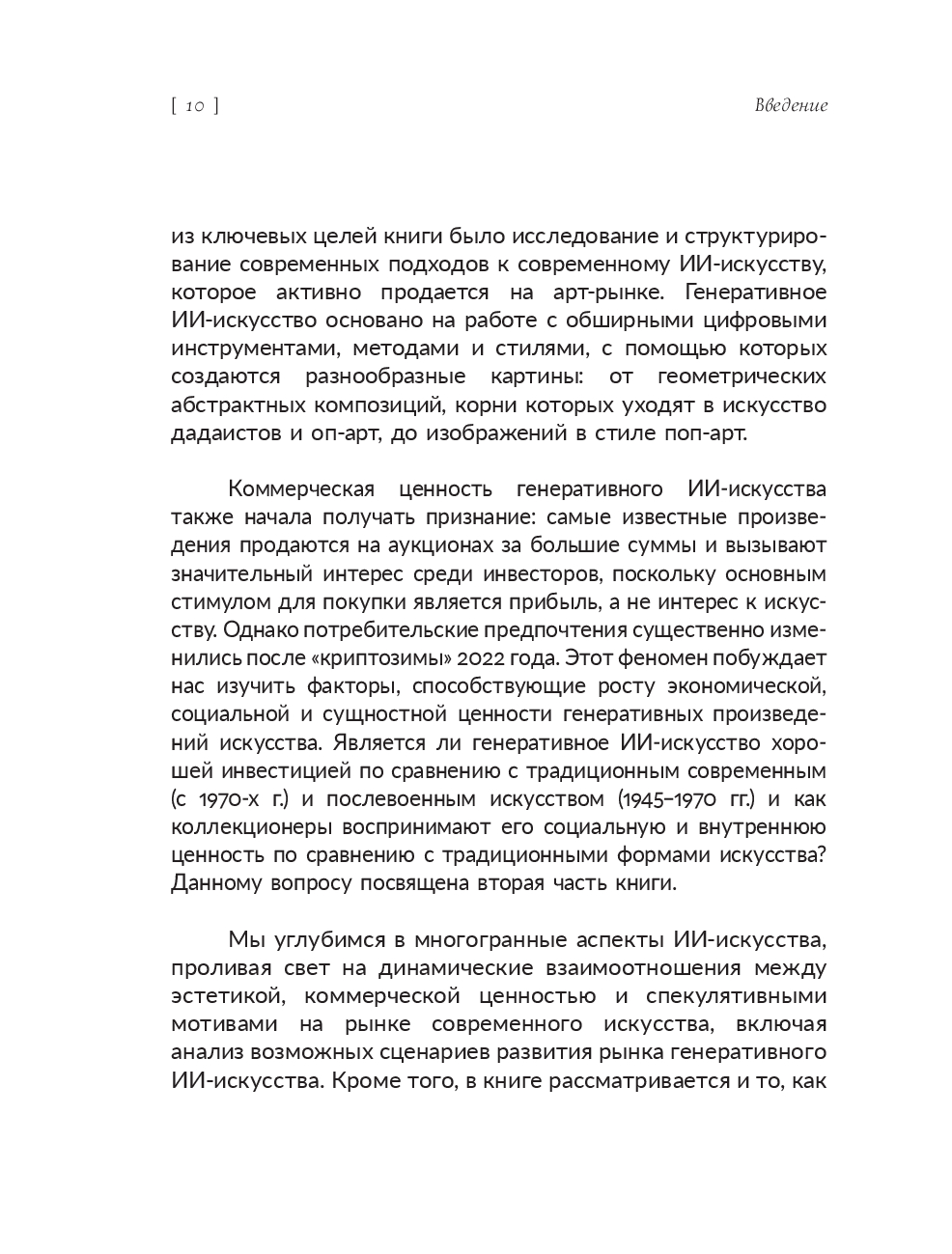 Эта книга исследует захватывающие перспективы использования ИИ в создании, сохранении и коммерциализации искусства, одновременно поднимая важные этические и юридические вопросы, возникающие вокруг этих процессов. Она станет незаменимым путеводителем для всех, кто стремится разобраться, каким образом технологии меняют облик мира искусства.