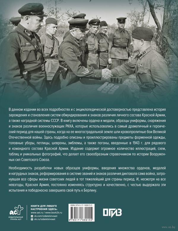 Эта книга посвящена униформе, знакам различия и наградам, которые были приняты в Вооруженных силах Советского Союза в период Великой Отечественной войны 1941–1945 гг. – самое тяжелое, драматичное и вместе с тем героическое время для армии и всего народа огромной страны. В данном издании с энциклопедической точностью и последовательностью рассказывается история зарождения и развития обмундирования, снаряжения и знаков различия Красной Армии, а также наградной системы СССР. Предметы форменной одежды, петлицы, эмблемы, нашивки, а также погоны, введенные в 1943 г. для личного состава РККА, описаны весьма подробно и исторически достоверно, а обширный наглядный материал включает иллюстрации, схемы, таблицы, документы и уникальные фотографии.