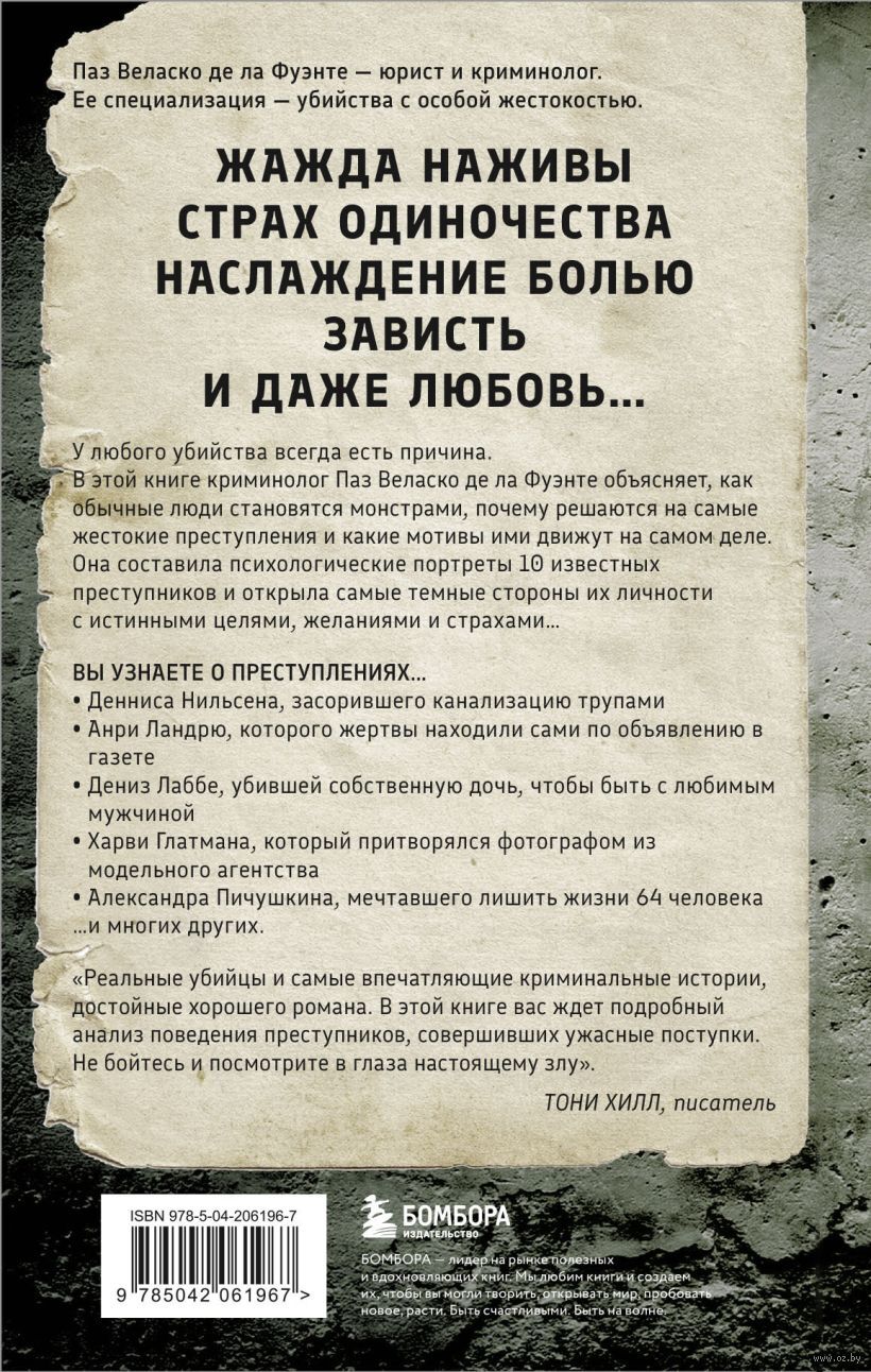 Жажда наживы, ненависть к женщинам, наслаждение болью или страх одиночества – это лишь некоторые причины, которые толкают людей на самые жестокие преступления. В этой книге криминолог Паз Веласко де ла Фуэнте расскажет о природе человеческого зла и объяснит, как обычные люди превратились в безжалостных убийц. Автор детально анализирует 10 самых известных преступлений, составляет психологические портреты каждого убийцы и открывает самые темные стороны их личностей…
