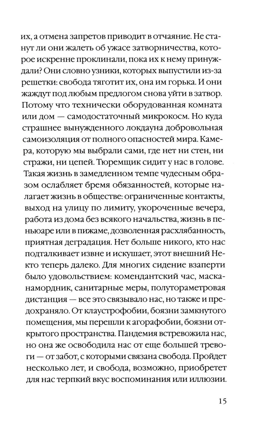 Цель этого эссе – исследовать менталитет отказа от деятельной жизни, понять его философские корни и исторические контуры. Никогда еще напряжение между желанием странствовать и вкусом к уединению не было таким сильным. А принудительное заключение, настоящий кошмар периода пандемии, похоже, для многих сменилось добровольной самоизоляцией. Нам грозит не тирания здоровья, а тирания сидячего образа жизни: станут ли тапочки и халат его новыми атрибутами?