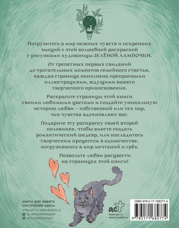 Погрузитесь в мир нежных чувств и искренних эмоций с этой волшебной раскраской, посвящённой любви во всех её проявлениях. От трепетных первых свиданий до трогательных моментов семейного счастья, каждая страница наполнена прекрасными иллюстрациями, ждущими вашего творческого прикосновения. Дайте волю своей фантазии, раскрашивая истории любви, нежности и преданности. Раскрасьте страницы этой книги своими любимыми цветами и создайте уникальную историю любви – собственной или тех пар, чьи чувства вдохновляют вас. Подарите эту раскраску своей второй половинке, чтобы вместе создать романтический шедевр, или насладитесь творческим процессом в одиночестве, погрузившись в мир мечтаний и грёз. Позвольте любви расцвести на страницах этой книги!