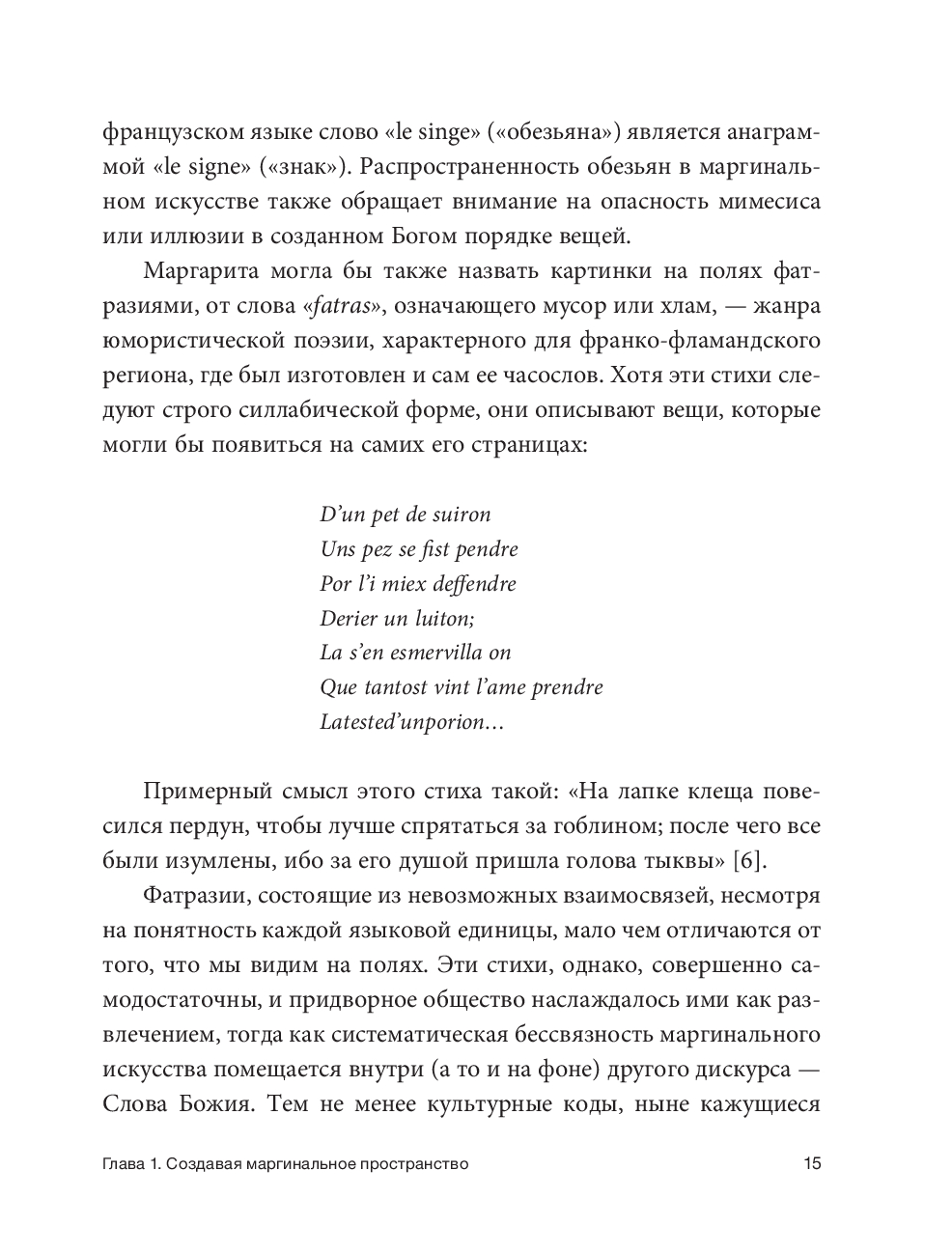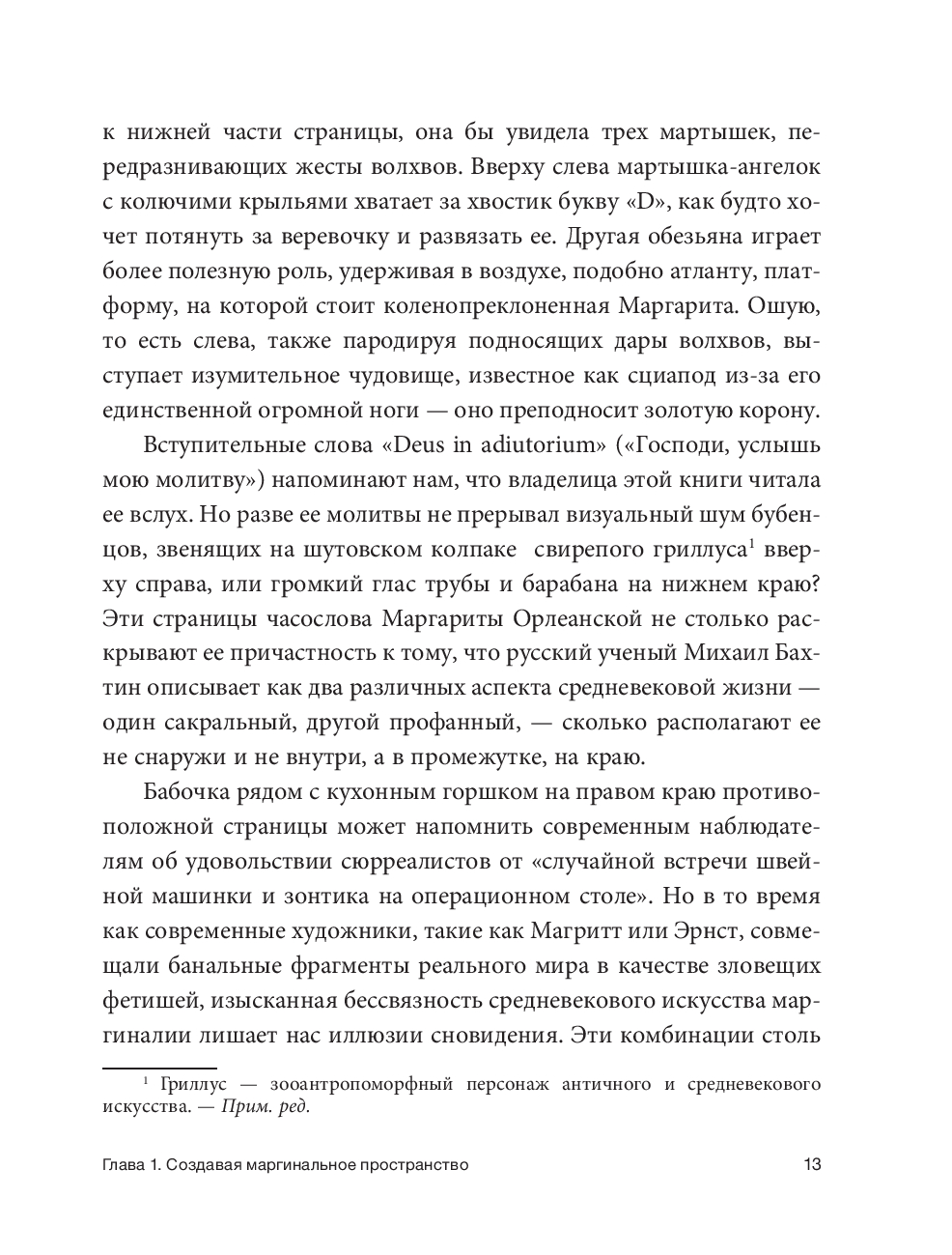 Майкл Камил исследует буйное царство маргинального искусства, анализируя его символику, функции и социокультурный контекст, который часто остается вне поля зрения большинства исследователей. Читатель узнает, зачем на крыши соборов помещали статуи гаргулий и химер, какую роль играли изображения акробатов и шутов в убранстве монастырей, а также почему священнослужители, рыцари, крестьяне и проститутки становились участниками непристойных и потешных сцен на полях средневековых изданий часословов и работ древних философов. Особое внимание автор уделяет взаимодействию между текстом и изображением, а также тому, как маргинальная иконография отражала мировоззрение и повседневную жизнь людей того времени.