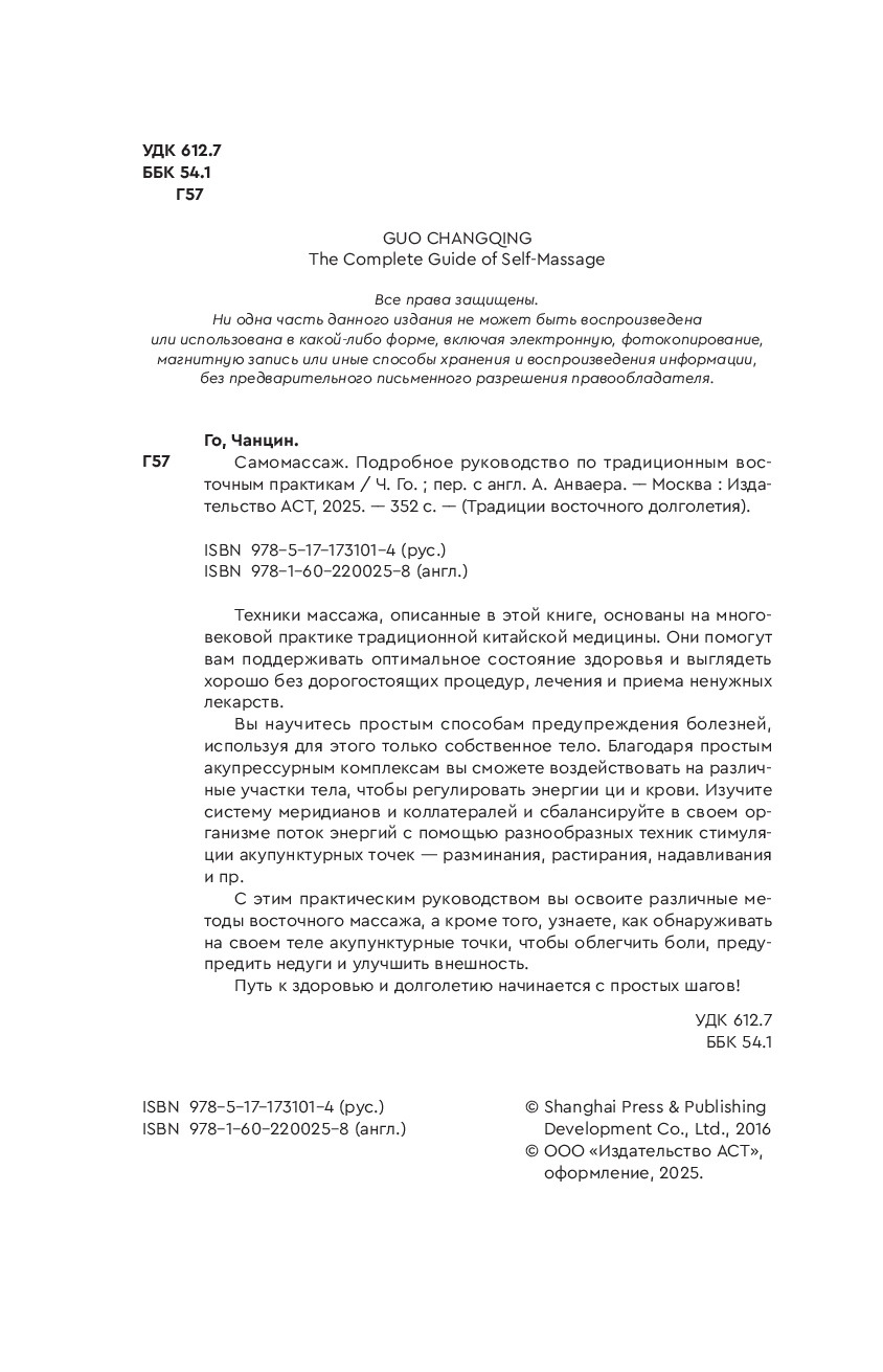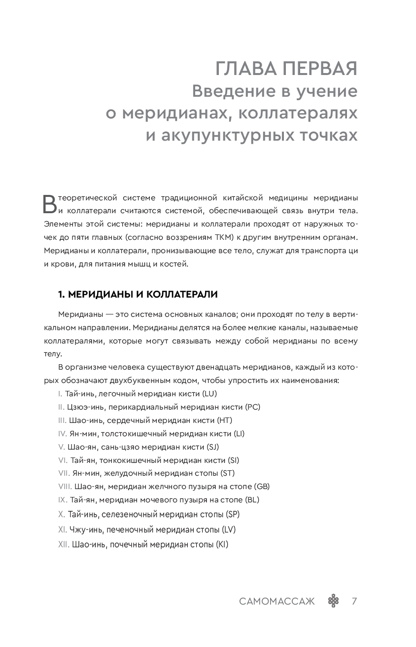 Вы научитесь простым способам предупреждения болезней, используя для этого только собственное тело. Благодаря простым акупрессурным комплексам вы сможете воздействовать на различные участки тела, чтобы регулировать энергии ци и крови. Изучите систему меридианов и коллатералей и сбалансируйте в своем организме поток энергий с помощью разнообразных техник стимуляции акупунктурных точек – разминания, растирания, надавливания и пр.