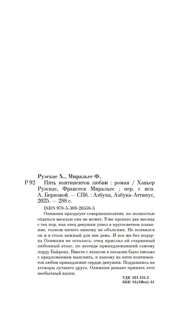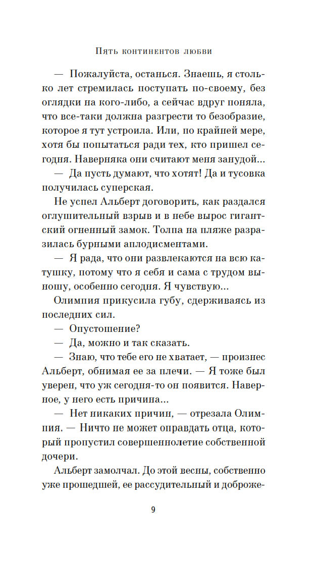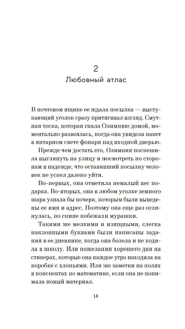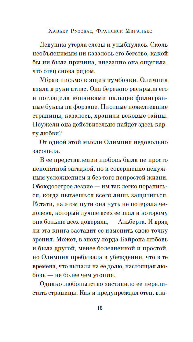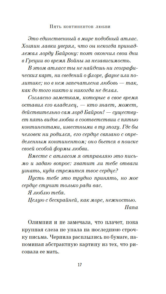 Олимпия празднует совершеннолетие, но полностью отдаться веселью она не может. Уже прошло два месяца с тех пор, как отец девушки ушел в кругосветное плавание, толком ничего никому не объяснив. Не появился он и в столь важный для нее день. И все же без подарка Олимпия не осталась: отец прислал ей старинный любовный атлас, по легенде принадлежавший самому лорду Байрону. Вместе с атласом в посылке было письмо с предложением выяснить, к какому из пяти континентов любви принадлежит сердце девушки. Поддавшись на уговоры лучшего друга, Олимпия решает принять этот необычный вызов.