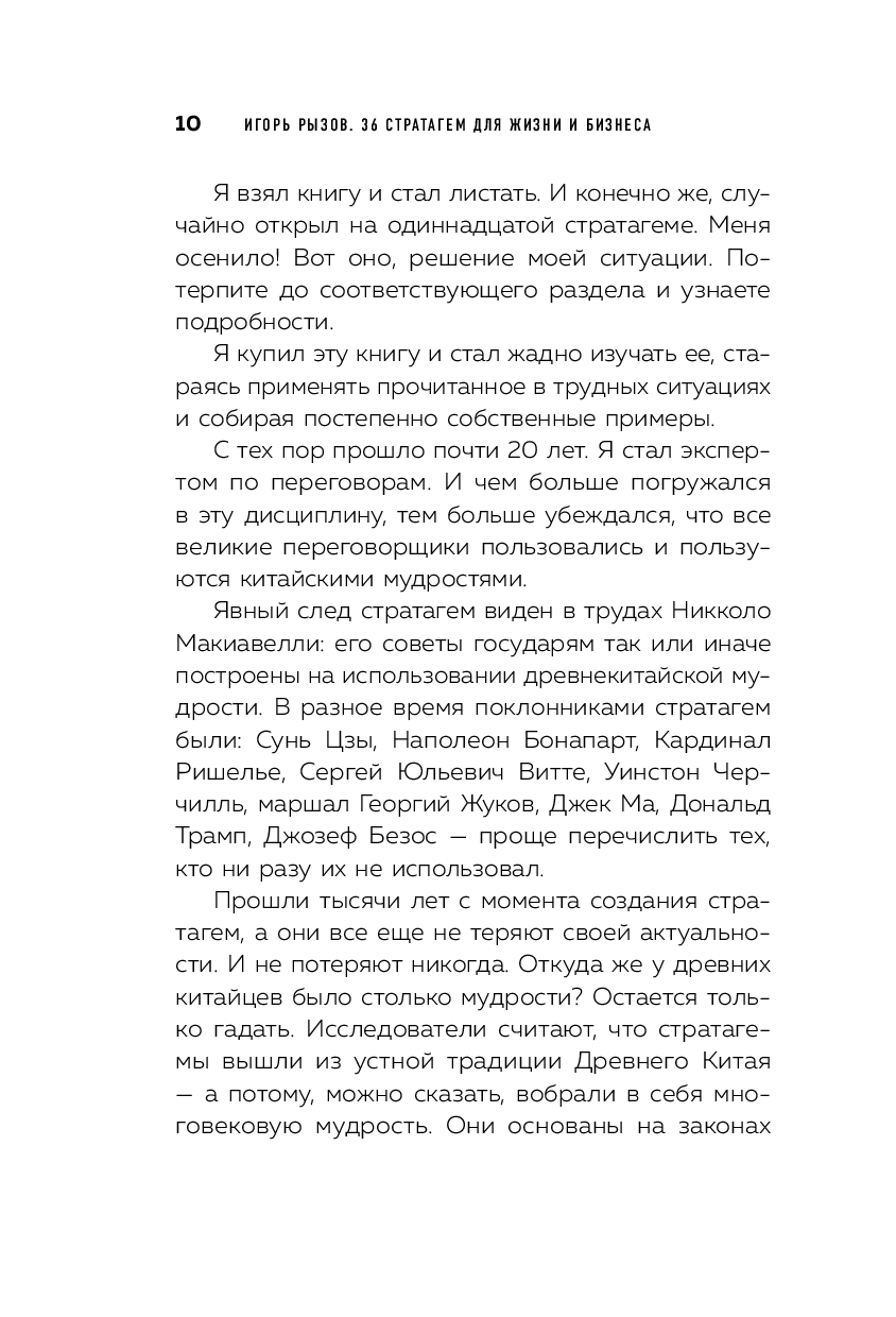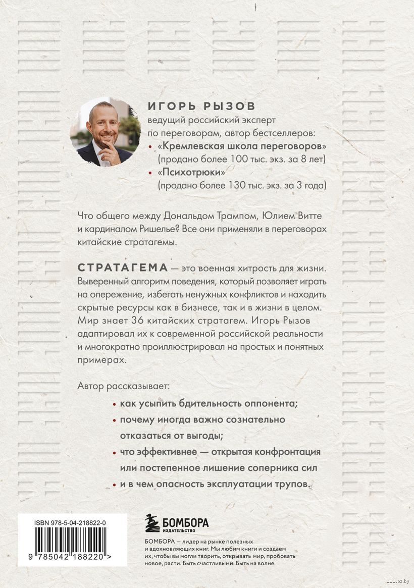 Стратагема – это военная хитрость для жизни. Выверенный алгоритм поведения, который позволяет играть на опережение, избегать ненужных конфликтов и находить скрытые ресурсы как в бизнесе, так и в жизни в целом. Мир знает 36 китайских стратагем. Российский эксперт по переговорам Игорь Рызов адаптировал их к современной российской реальности и многократно проиллюстрировал на простых и понятных примерах.