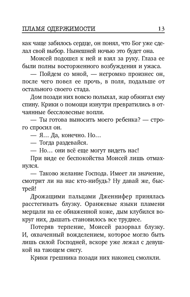 Когда при загадочных обстоятельствах несколько человек сгорели заживо в своих домах, Эбби Маллен, переговорщик полиции Нью-Йорка, сразу почувствовала: ужасы прошлого вернулись. Еще девочкой Эбби чудом спаслась от пожара, устроенного Моисеем Уилкоксом, фанатичным лидером секты. Он считался мертвым в течение тридцати лет. Но теперь на всех местах преступлений остались его следы...