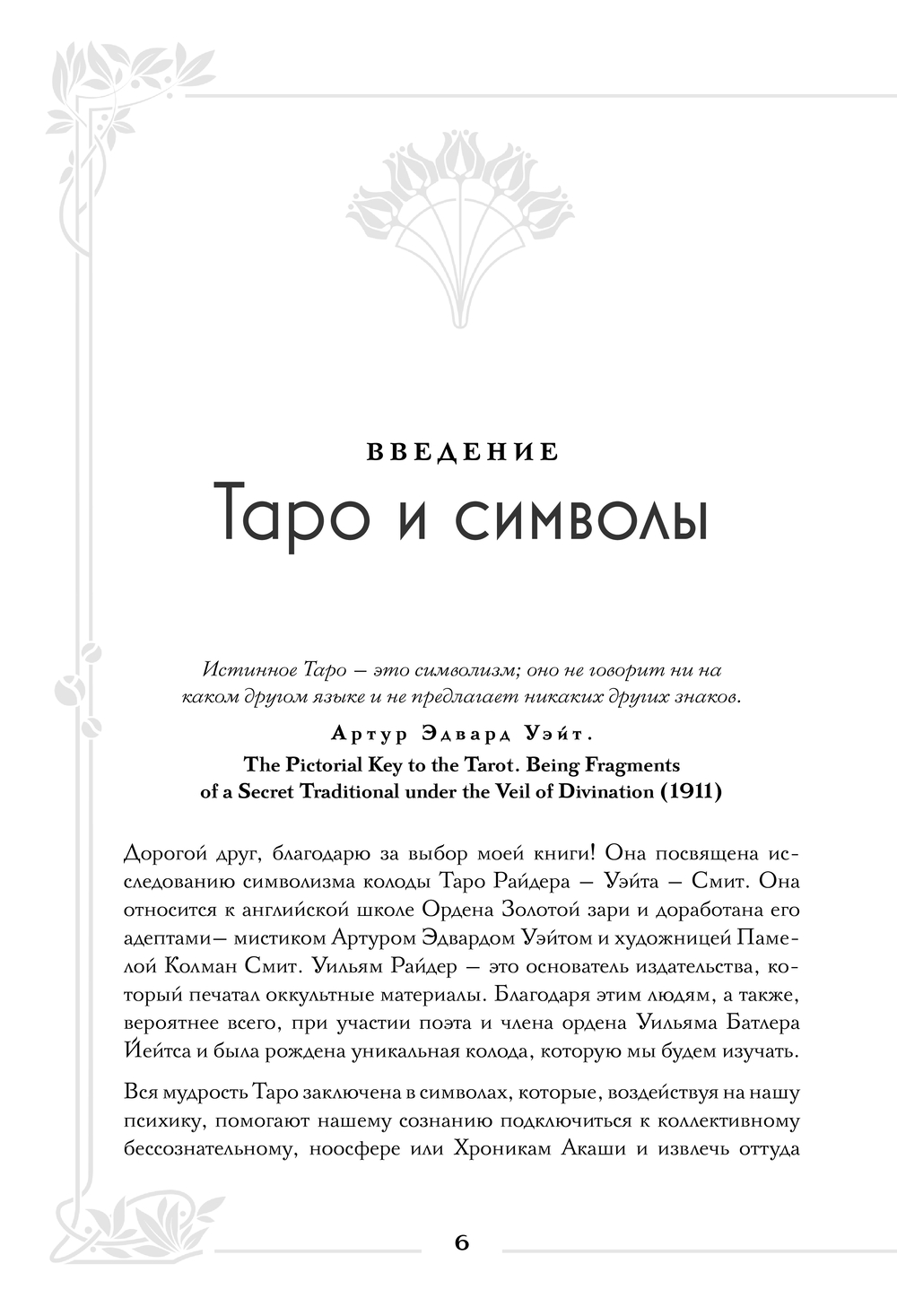 Автор книги подробно рассматривает и объясняет астрологические и мистические символы, помещенные на картах; анализирует символику цвета, природные явления и пейзажи; рассказывает о животных и растениях, каждое из которых нарисовано неспроста и делает своей вклад в толкование и послание карты. С этой книгой вы научитесь "читать" происходящее на картах и узнаете, какой смысл заложен в позах, жестах и одежде персонажей. Все это поможет сделать ваше понимание и толкование карт более глубоким и полным.