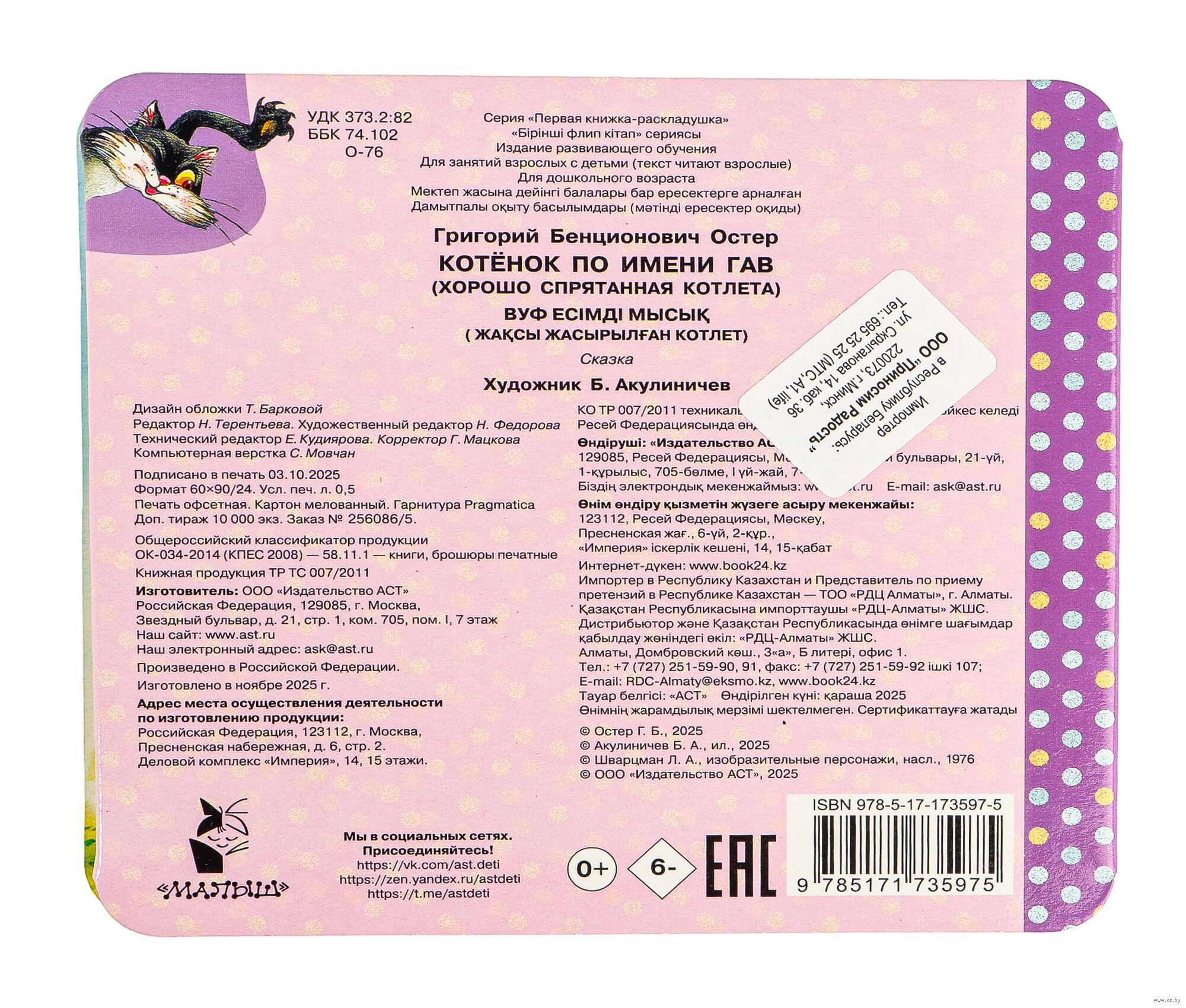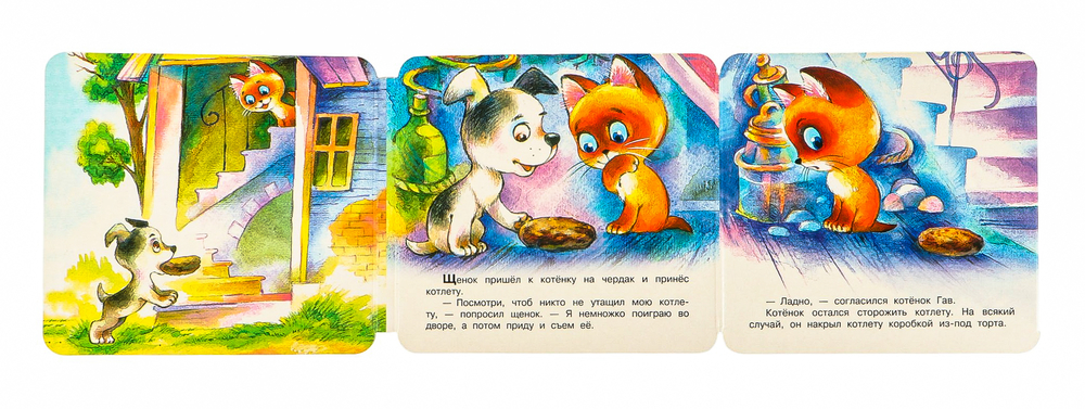 Ваш малыш уже знаком с котёнком по имени Гав и его другом щенком Шариком? Это знакомство можно начать или продолжить благодаря книжке-раскладушке. Небольшой формат, плотный картон – то, что нужно для маленьких ручек.