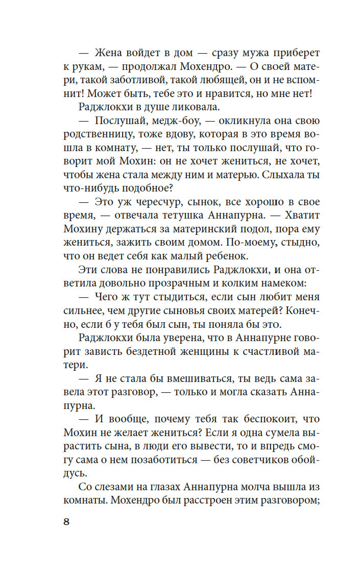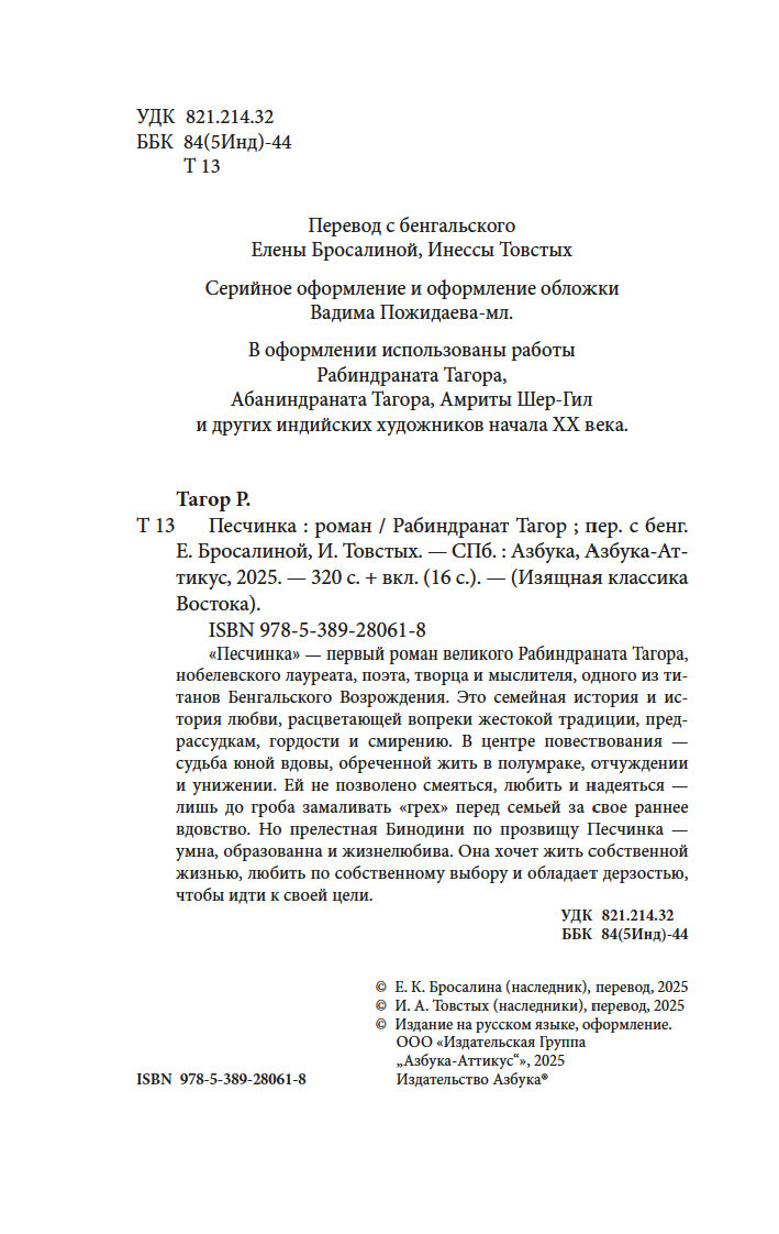 "Песчинка" – первый роман великого Рабиндраната Тагора, нобелевского лауреата, поэта, творца и мыслителя, одного из титанов бенгальского Возрождения. Это семейная история и история любви, расцветающей вопреки жестокой традиции, предрассудкам, гордости и смирению. В центре повествования – судьба юной вдовы, обреченной жить в полумраке, отчуждении и унижении. Ей не позволено смеяться, любить и надеяться – лишь до гроба замаливать "грех" перед семьей за свое раннее вдовство. Но прелестная Бинодини по прозвищу Песчинка – умна, образованна и жизнелюбива. Она хочет жить собственной жизнью, любить по собственному выбору и обладает дерзостью, чтобы идти к своей цели.