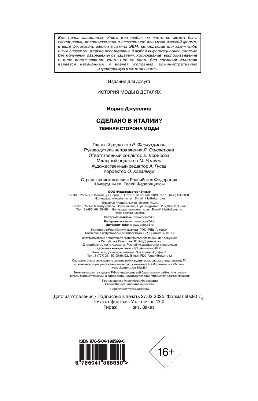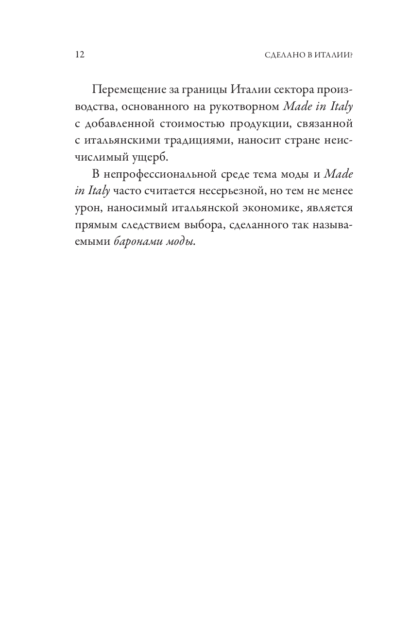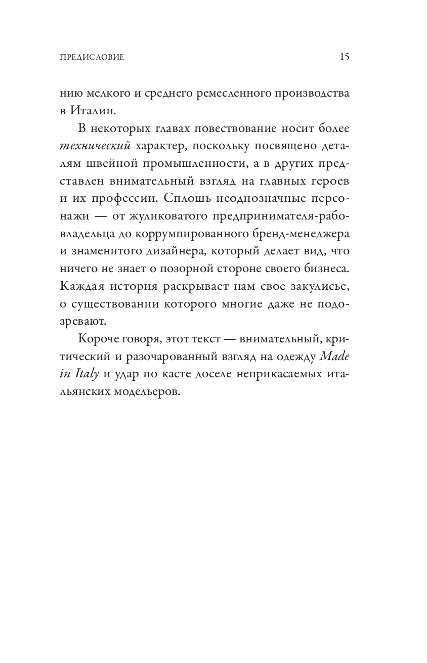 Made in Italy – идеальное качество, дорогие ткани и… очень много лжи. Журналист Джузеппе Иорио дерзко развенчивает самые распространенные мифы о великолепии мира итальянской моды. Это расследование откроет вам глаза на то, что стоит за всеми желанной биркой. В нем без прикрас показаны неприглядные стороны итальянской модной индустрии, которая с каждым годом все меньше связана с Италией и все больше зависит от слаборазвитых стран и полурабского труда. Джузеппе Иорио об этом знает из собственного опыта: в прошлом он распределял заказы Moncler, Louis Vuitton, Versace и Dolce&Gabbana в этих странах.