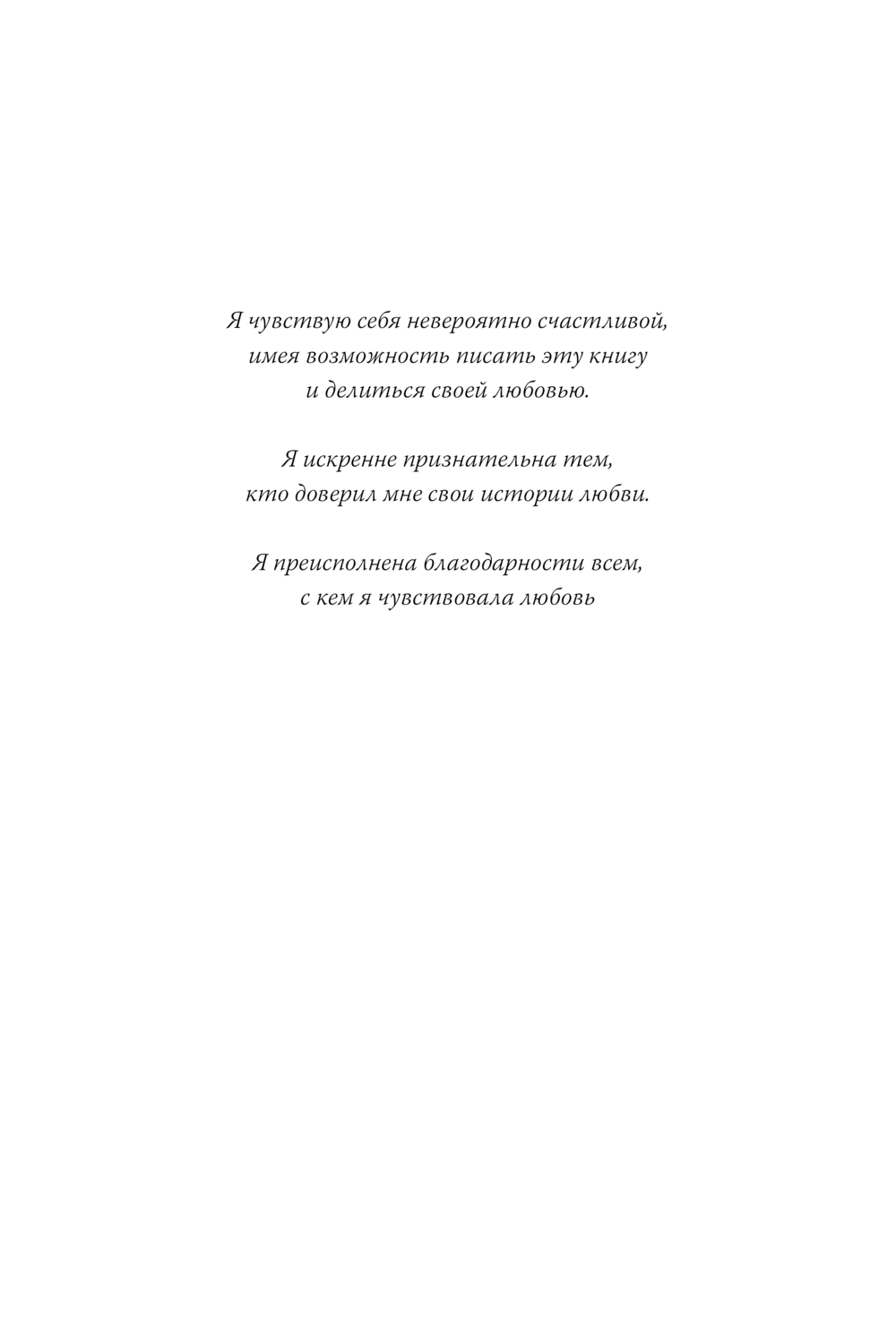 Наталия уверена: именно любовь – явление одновременно уникальное и универсальное, целостное и многогранное для каждого из нас, переживание, которое невозможно тиражировать или контролировать – это та энергия, которая необходима, чтобы стать собой, неповторимым и незаменимым.