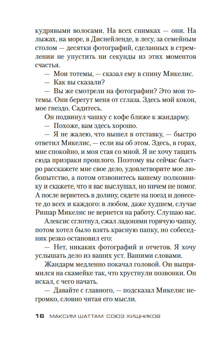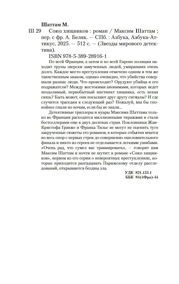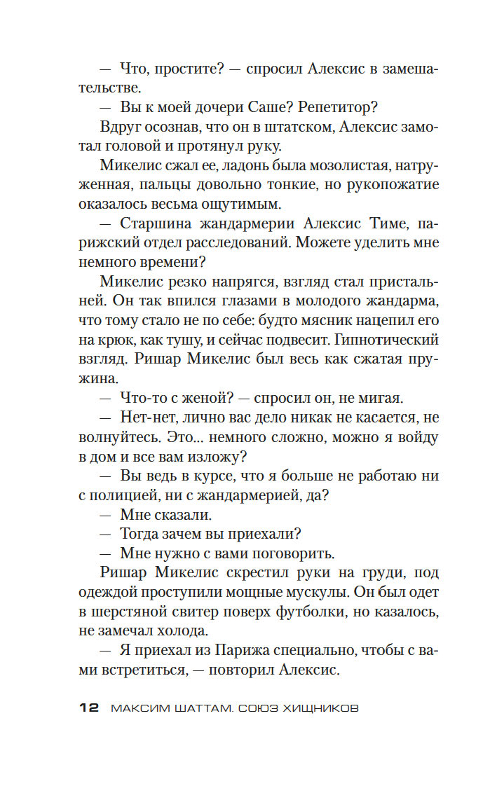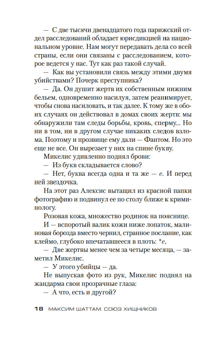 Детективные триллеры и нуары Максима Шаттама только во Франции расходятся миллионными тиражами и стали бестселлерами еще в двух десятках стран. Поклонники Жан-Кристофа Гранже и Франка Тилье не могут не оценить эти туго закрученные романы, в которых события мчатся во весь опор с первых строк до совершенно ошеломительного финала и никто из героев не отделывается легкими ушибами. "Очень рад, что сумел вас травмировать", – говорит нам Максим Шаттам и почти не шутит: в романе "Союз хищников", первом из его серии о невероятных преступлениях, которые приходится разгадывать Парижскому отделу расследований, открываются бездны зла.