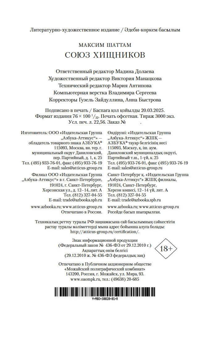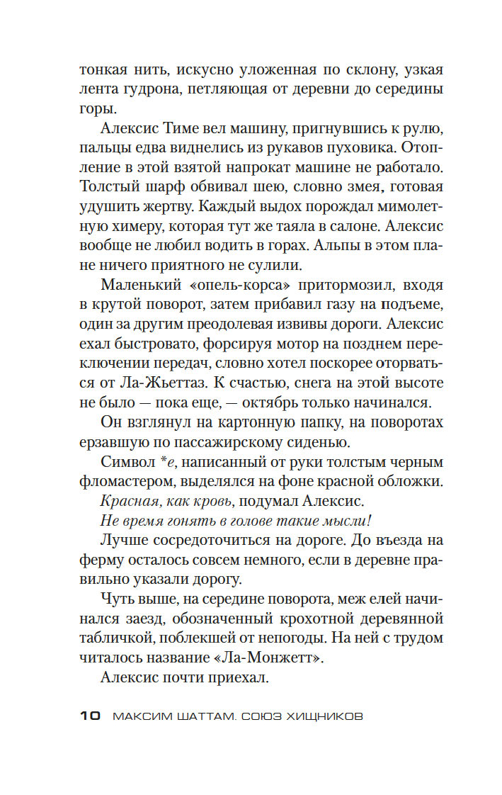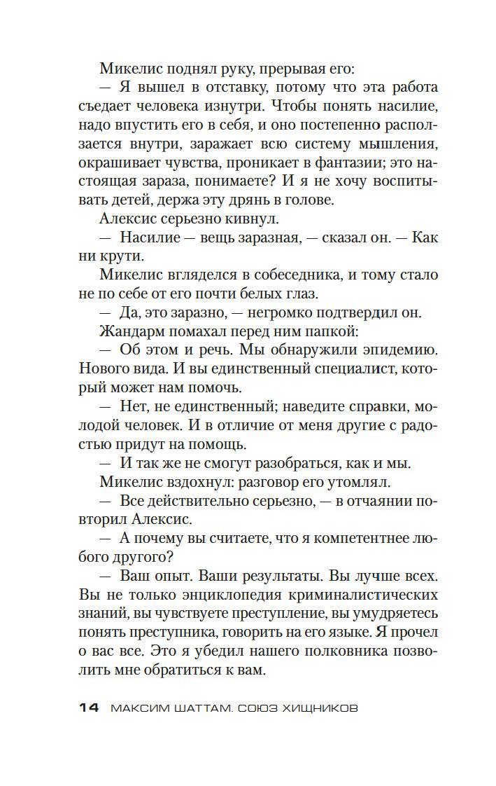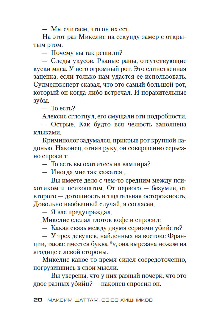 Детективные триллеры и нуары Максима Шаттама только во Франции расходятся миллионными тиражами и стали бестселлерами еще в двух десятках стран. Поклонники Жан-Кристофа Гранже и Франка Тилье не могут не оценить эти туго закрученные романы, в которых события мчатся во весь опор с первых строк до совершенно ошеломительного финала и никто из героев не отделывается легкими ушибами. "Очень рад, что сумел вас травмировать", – говорит нам Максим Шаттам и почти не шутит: в романе "Союз хищников", первом из его серии о невероятных преступлениях, которые приходится разгадывать Парижскому отделу расследований, открываются бездны зла.