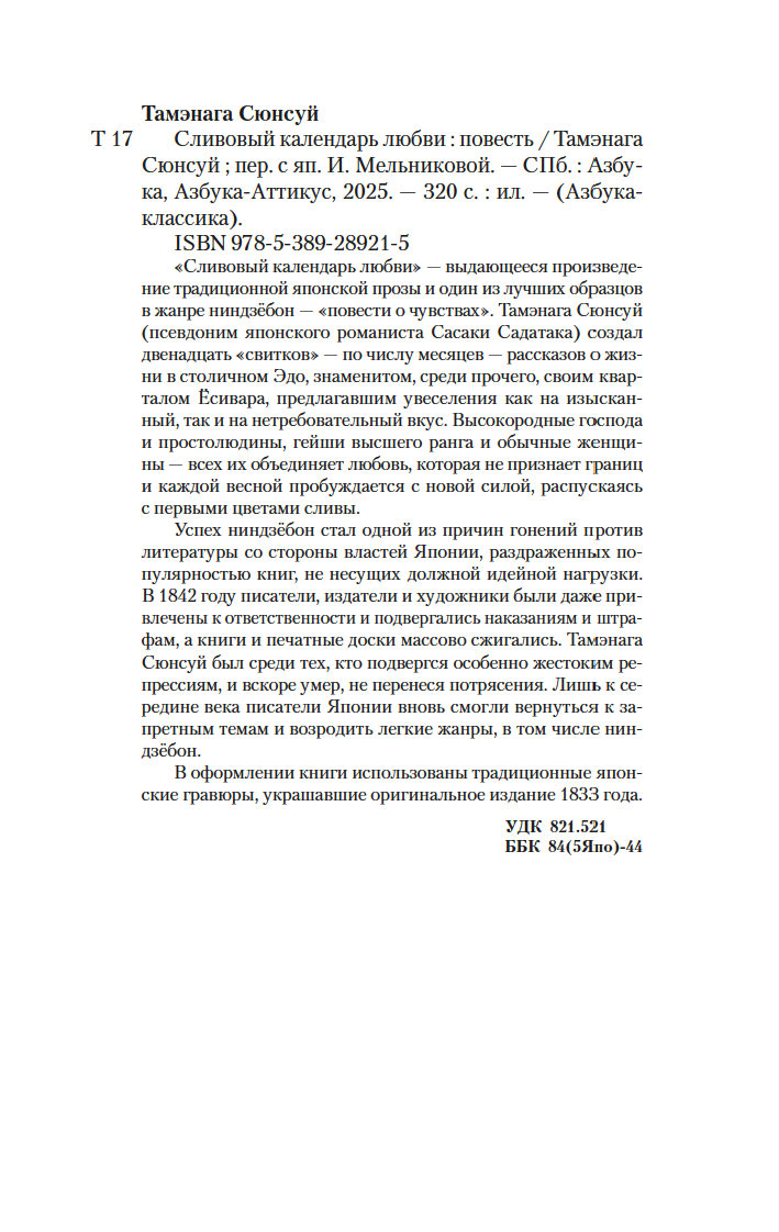 "Сливовый календарь любви" – выдающееся произведение традиционной японской прозы и один из лучших образцов в жанре ниндзёбон – "повести о чувствах". Тамэнага Сюнсуй (псевдоним японского романиста Сасаки Садатака) создал двенадцать "свитков" – по числу месяцев – рассказов о жизни в столичном Эдо, знаменитом, среди прочего, своим кварталом Ёсивара, предлагавшим увеселения как на изысканный, так и на нетребовательный вкус. Высокородные господа и простолюдины, гейши высшего ранга и обычные женщины – всех их объединяет любовь, которая не признает границ и каждой весной пробуждается с новой силой, распускаясь с первыми цветами сливы.