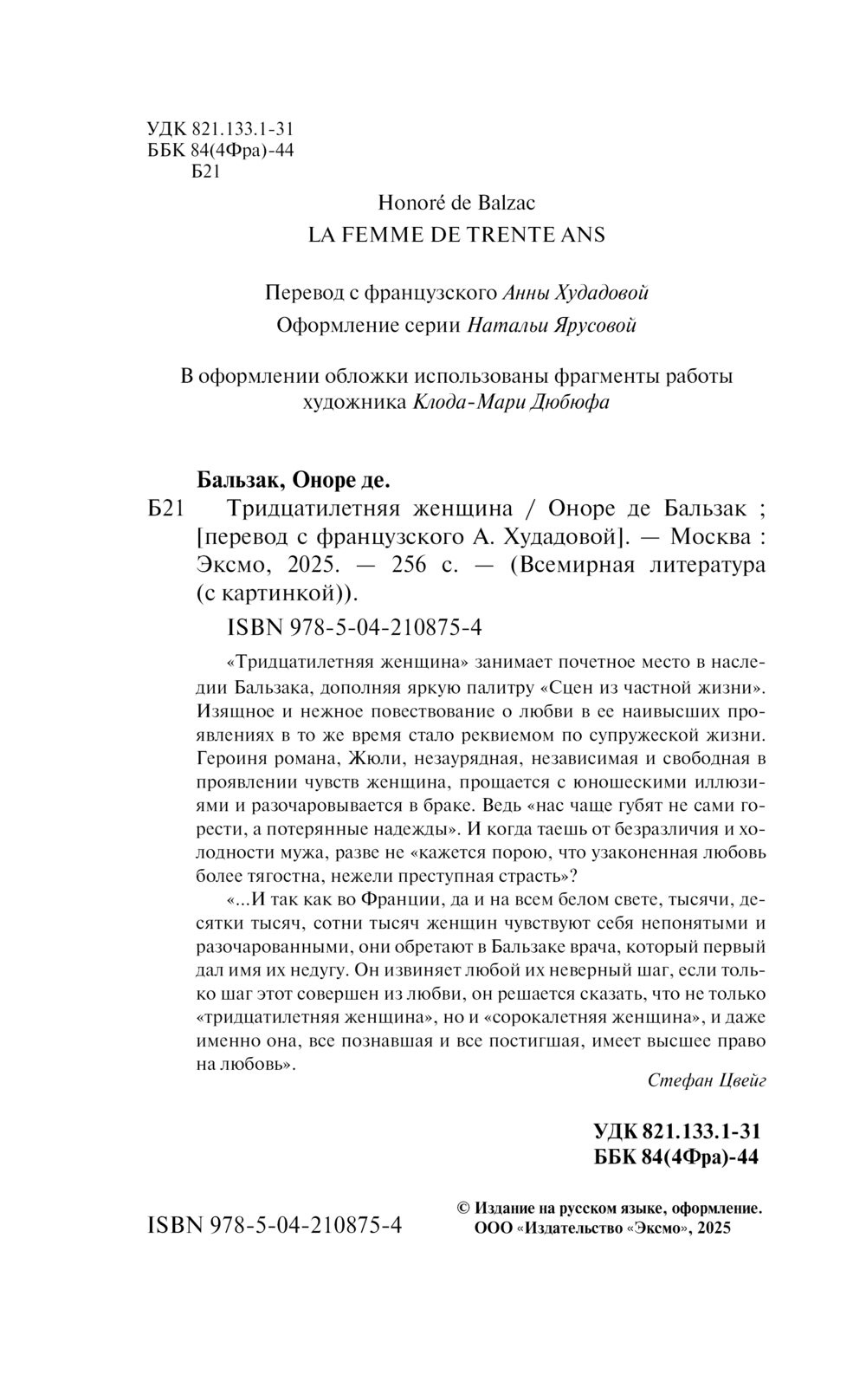 "...И так как во Франции, да и на всем белом свете, тысячи, десятки тысяч, сотни тысяч женщин чувствуют себя непонятыми и разочарованными, они обретают в Бальзаке врача, который первый дал имя их недугу. Он извиняет любой их неверный шаг, если только шаг этот совершен из любви, он решается сказать, что не только "тридцатилетняя женщина", но и "сорокалетняя женщина", и даже именно она, все познавшая и все постигшая, имеет высшее право на любовь". Стефан Цвейг