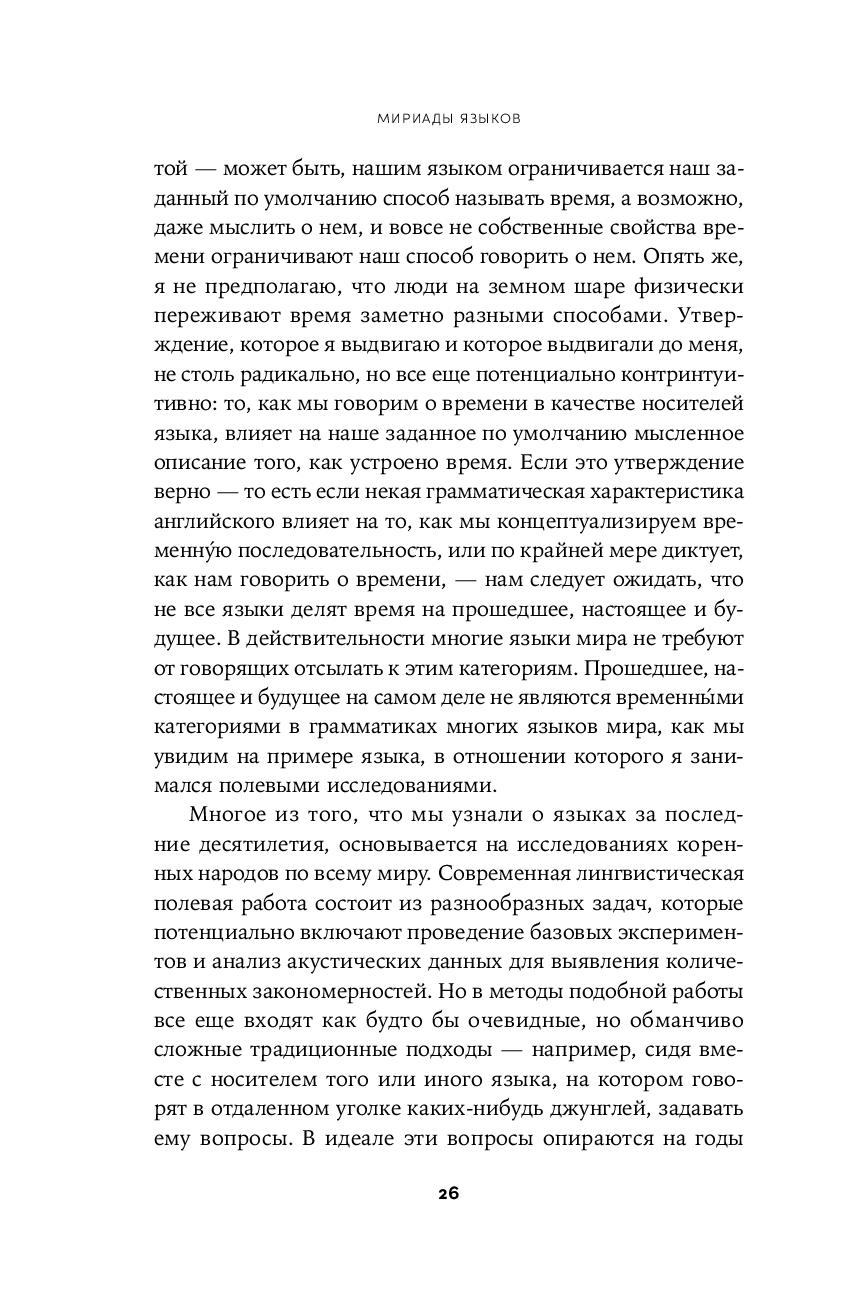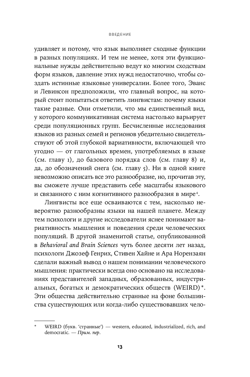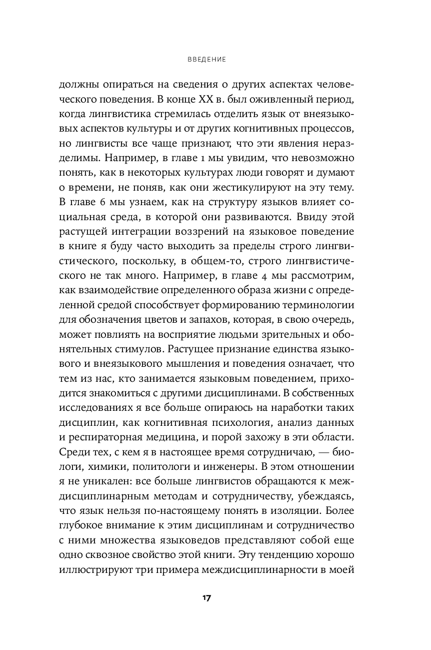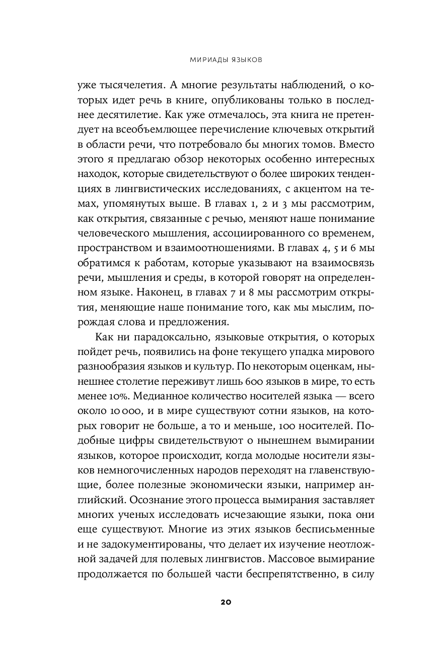 Эверетт сочетает научную точность и доступность изложения: сложные концепции иллюстрируются яркими примерами из разных языков мира. Главная ценность книги в том, что она обобщает новейшие открытия в лингвистике, многие из которых были сделаны при изучении редких языков малых народов. Здесь представлен свежий взгляд на фундаментальные вопросы о природе языка и человеческого познания.