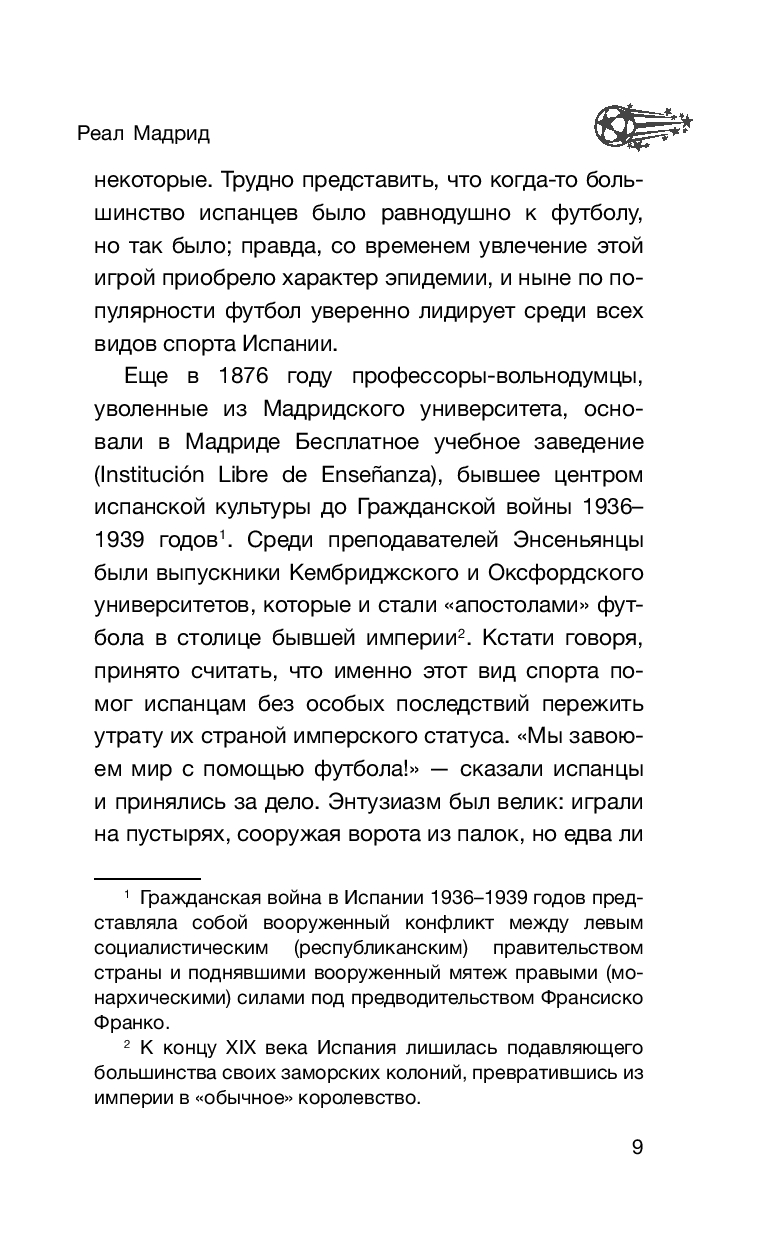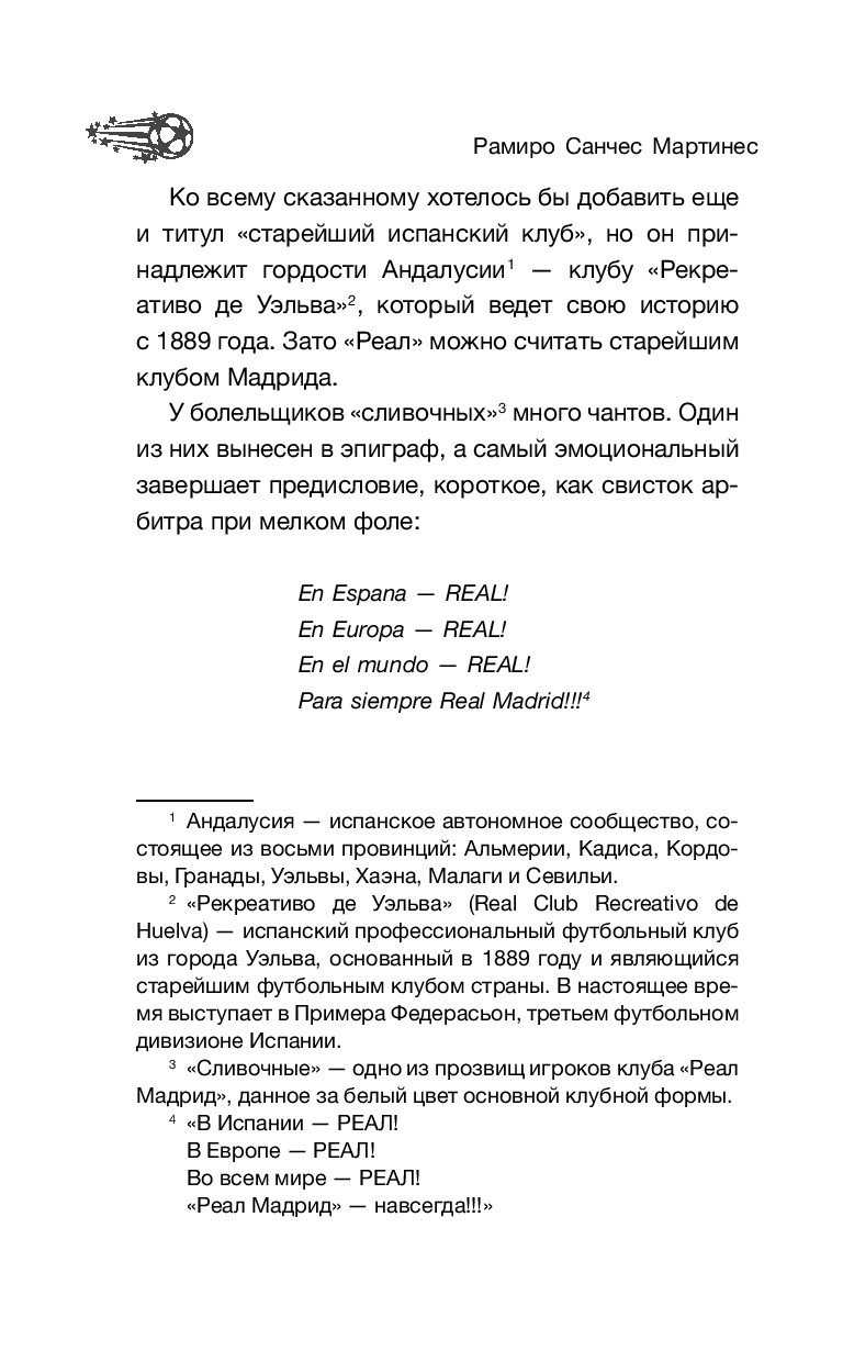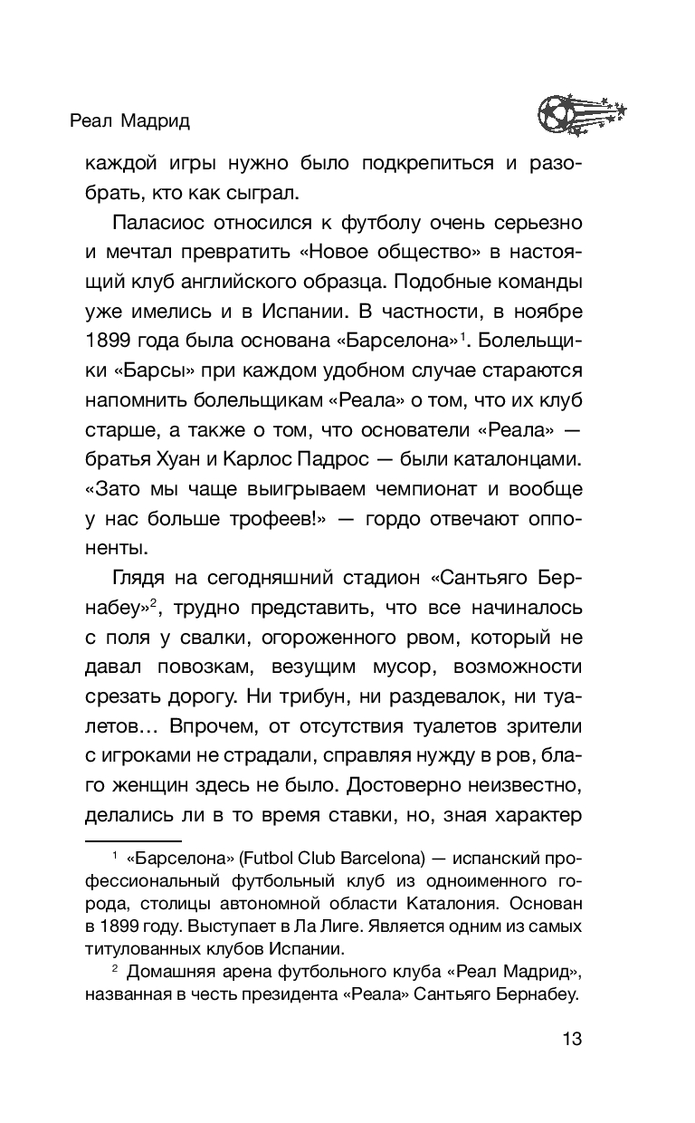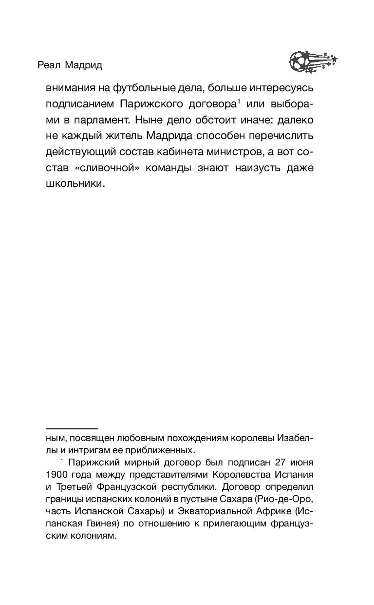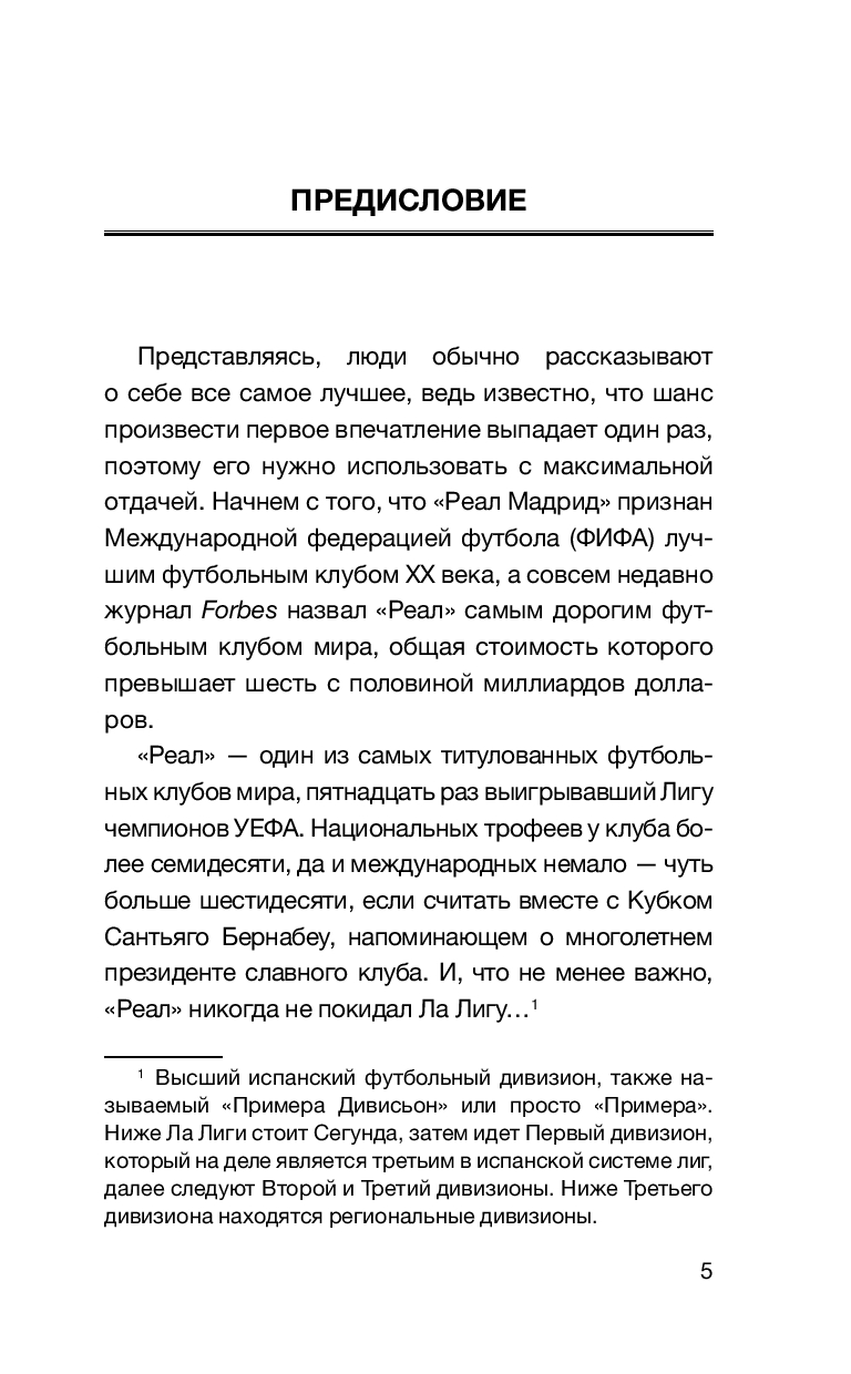 "Реал Мадрид" – клуб с историей. И пусть она не такая длинная, как у некоторых, стоявших на заре появления профессионального футбола английских команд и как у заклятого врага "Реала" "Барселоны", зато славная, наполненная победами и трофеями. Что же это за история? В ней соседствуют интриги в руководстве клуба – и самоотверженность многих его президентов; споры и разлады между президентом, тренером, членами команды, а также среди игроков – и примеры удивительной сплоченности всех занимающих эти позиции людей для достижения общих целей; в ней гениальные наставники приходят на смену ни на что негодным, а "звездные" футболисты приводят команду как к великим достижениям, так и к глубоким провалам.