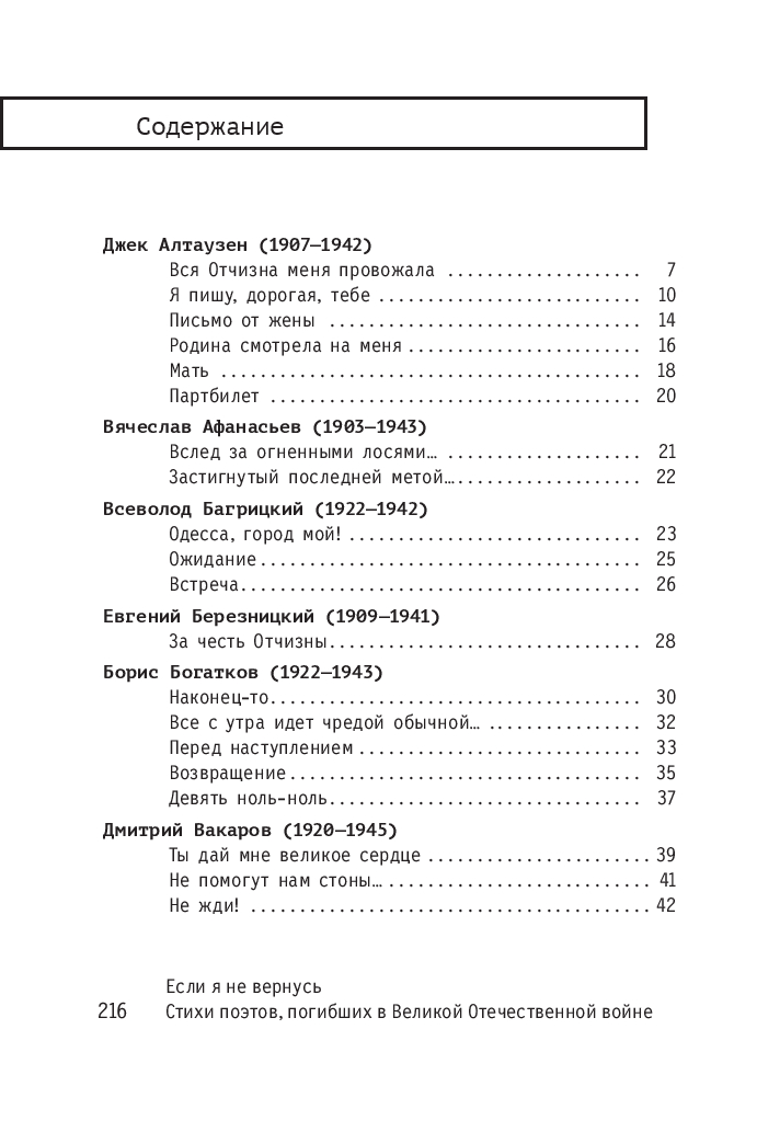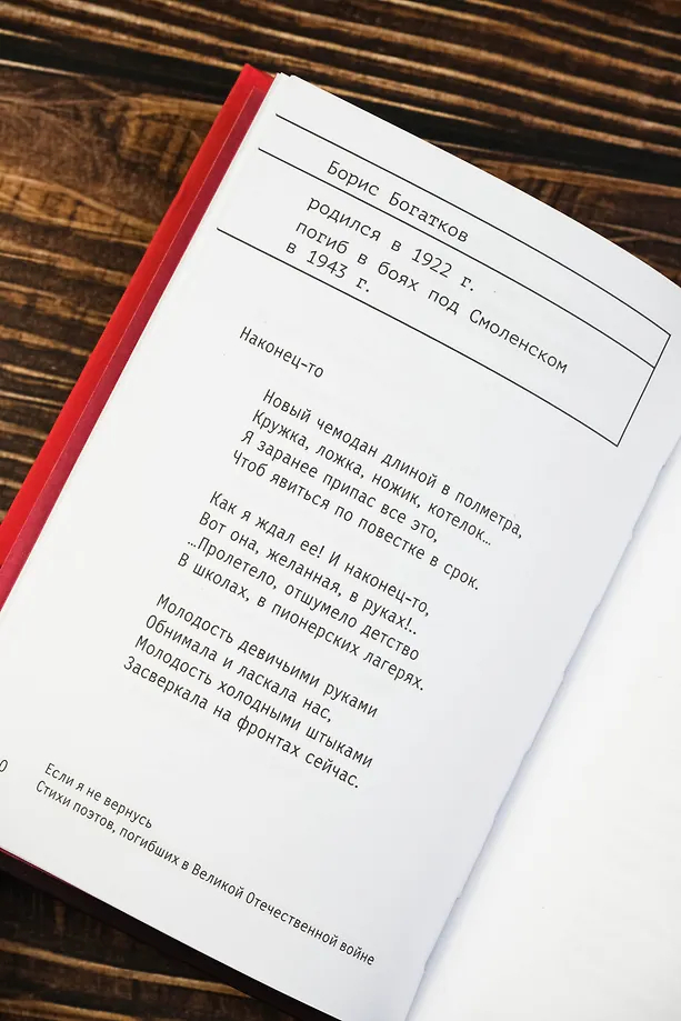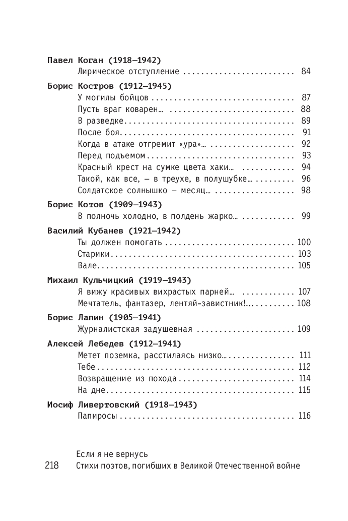 Сборник "Если я не вернусь" – подлинный документ военного времени. Стихи, написанные кровью – на полях сражений, в окопах, в минуты затишья перед боем. Под Ленинградом пал Всеволод Багрицкий, убиты в боях под Смоленском Борис Богатков и Николай Майоров, под Киевом погиб Борис Лапин, в боях под Сталинградом и Новороссийском геройски пали Михаил Кульчицкий и Павел Коган…