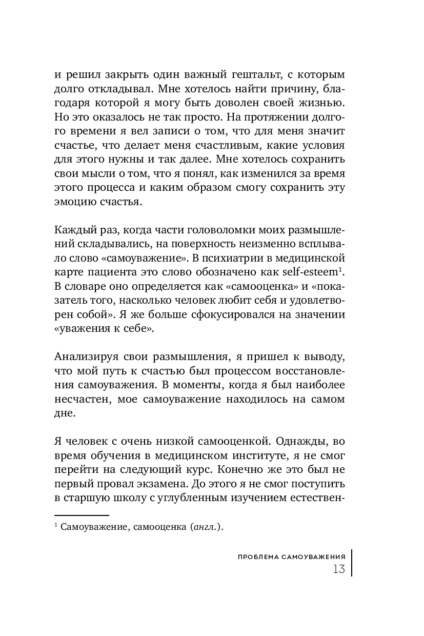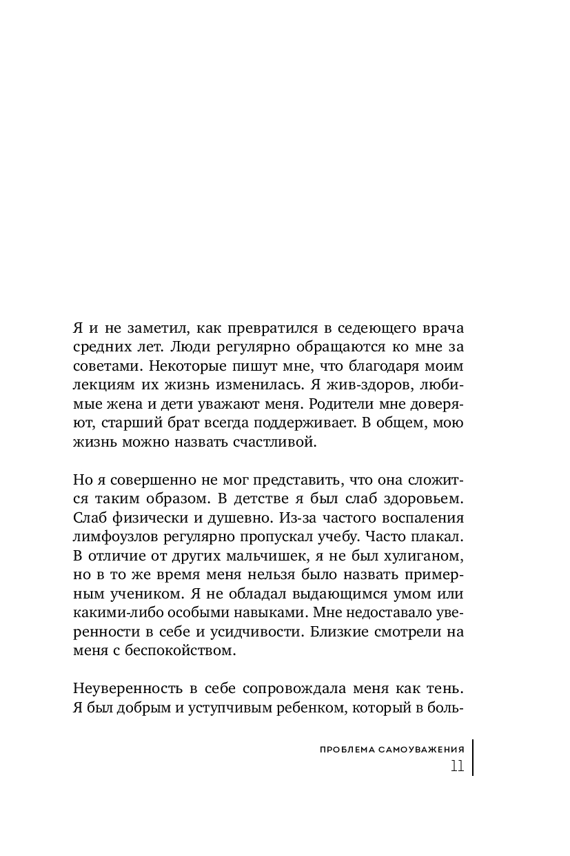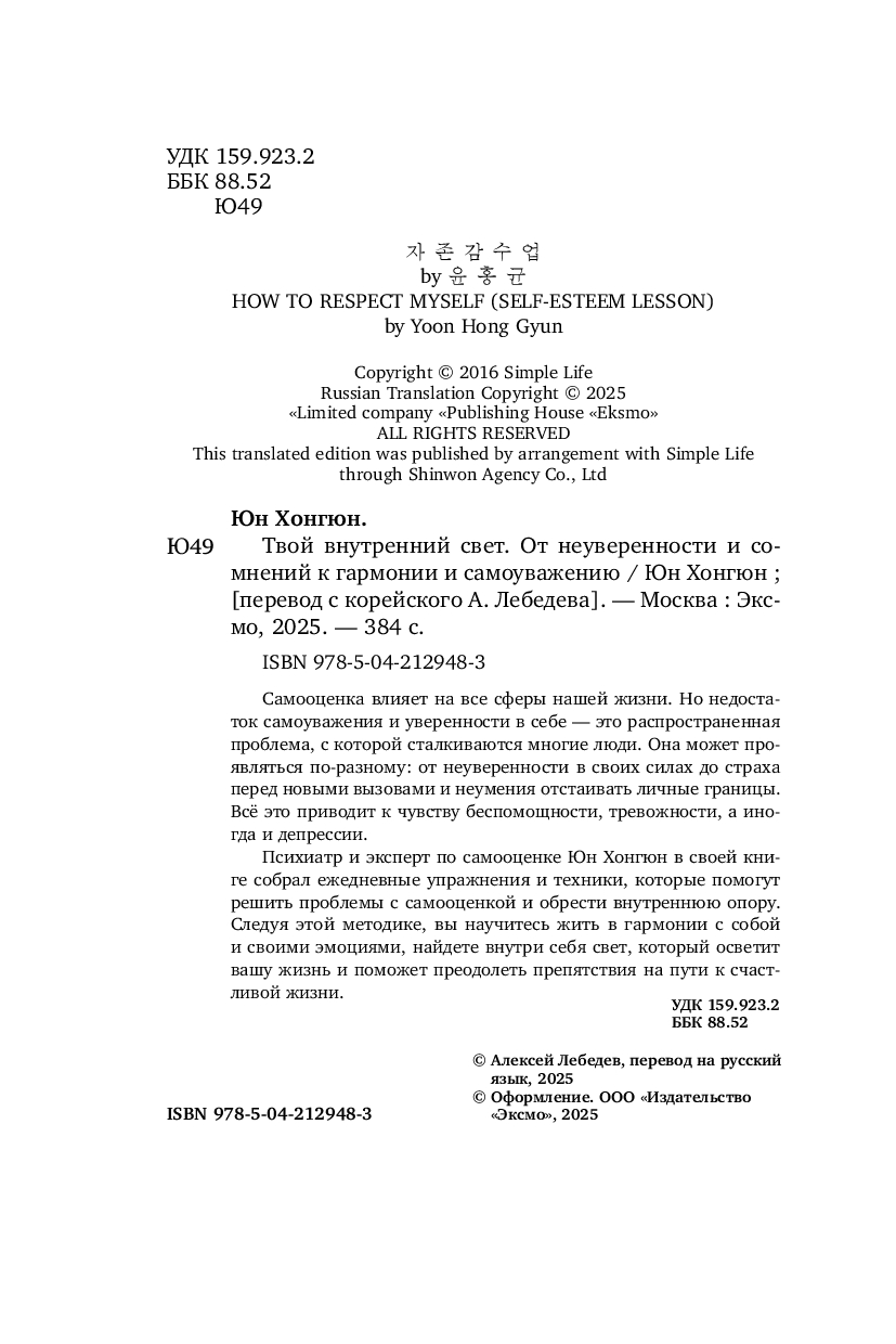Психиатр и эксперт по самооценке Юн Хонгюн в своей книге собрал ежедневные упражнения и техники, которые помогут решить проблемы с самооценкой и обрести внутреннюю опору. Следуя этой методике, вы научитесь жить в гармонии с собой и своими эмоциями, найдете внутри себя свет, который озарит вашу жизнь и поможет преодолеть препятствия на пути к счастливой жизни.